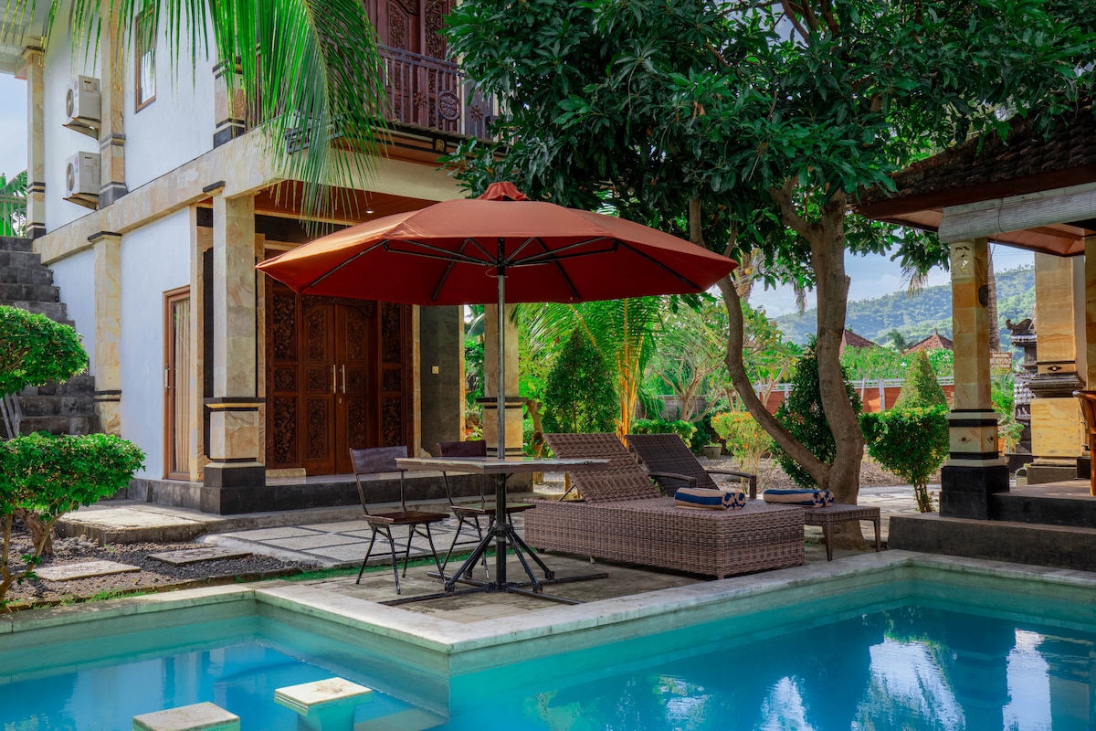 Stílusos, kényelmes és teljesen felszerelt nyaraló tágas nappalival, három hálószobával és fürdőszobával, végtelenített medencével, zavartalan kilátással a tengerre (Lombokkal és Gilis-szel a láthatáron) és közvetlen tengerparti hozzáféréssel. Csendes hely gyönyörű kertekkel körülvéve, hátul hegyekkel, elöl tengerrel / stranddal. Számos helyi és nemzetközi ételeket kínáló étterem, valamint egy gyógyfürdő mindössze néhány lépésre található az ingatlantól.