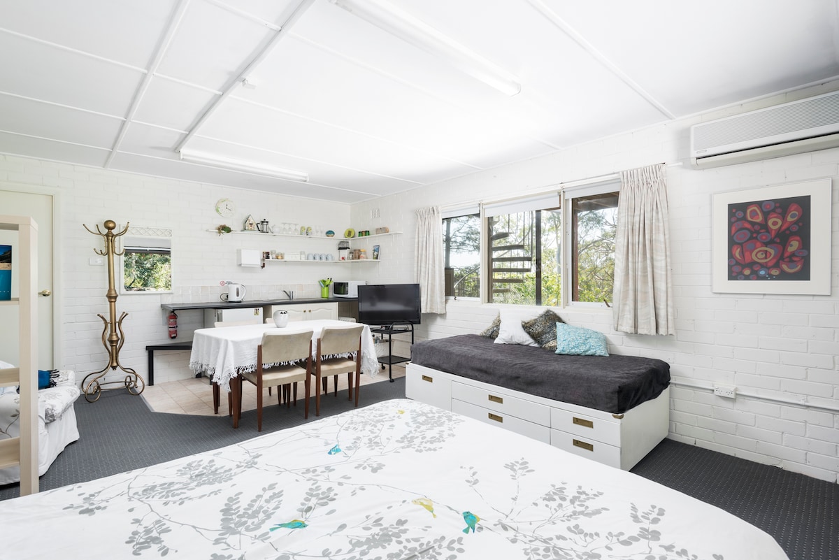 A Urban Space jóvoltából a 14 legjobb Airbnb-szálláshely egyikét értékelte Sydney-ben. Világos, virágokkal és páfrányokkal teli stúdió, valamint egy pompás kőfürdő két főre. Kiterjedt kertekre nyíló kilátás a kertkaputól a strandra. Minden alapvető kellék: saját fürdőszoba, teakonyha, beleértve a mikrohullámú sütőt, kenyérpirítót, kávéfőzőt és kancsót. Szomszédos, fedett grill és gázgyűrű. Organikus termékek és friss gyümölcsök a reggelivel. Tájékoztass, ha glutén- vagy laktózmentes. Megjegyzés: Felnőttek egyetlen elvonulása, gyermekek és háziállatok nélkül.