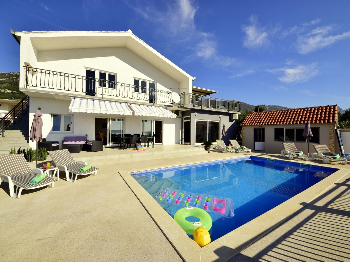A villa két emeleten található, belső lépcsőkkel összekötve. A földszinten található egy nappali kijárattal és kilátással a medencére, konyha fedett kültéri grillezővel , fürdőszoba és szoba saját fürdőszobával A második emeleten 3 szoba található, egy galéria, amely az égre és a fürdőszobára néz. Kint van egy medence, egy napozóhely, egy zuhanyzó, egy jacuzzi és egy trambulin. A ház 4 parkolóhely, Split 16km, repülőtér 3km, Trogir 13km, strand nagyon közel,Busz, gyógyszertár, piac, pékség 100m.