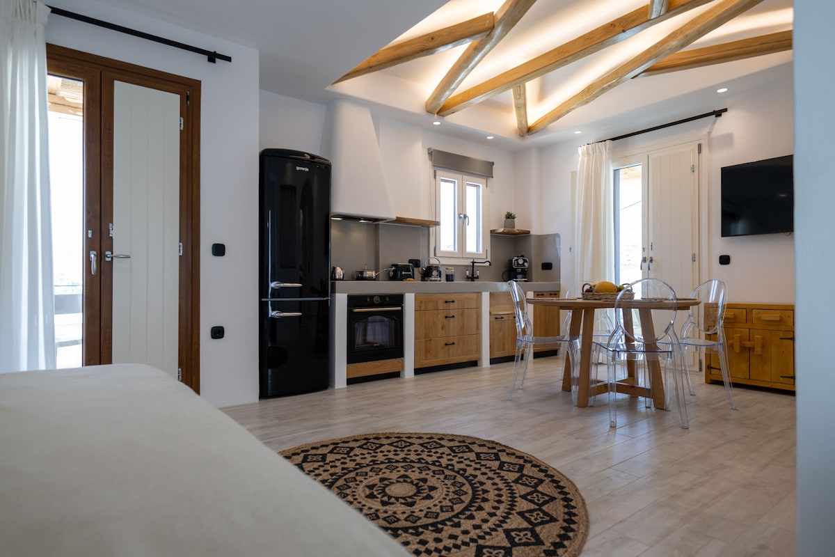 Nyisd ki a tengerkék redőnyöket, és engedd be a hűs szellőt, majd készíts egy kis harapnivalót a városi beton konyhapultnál egy szellős vízparti menedékhelyen. Lépj fel a tágas, lombos verandára, ahol kényelmesen elfogyaszthatod a naplementét, ahonnan akadálytalan kilátás nyílik az óceánra! Az apartman mellett található egy homokos strand egy reggeli úszás és egy 2 perces sétára található a központtól Naousa és a főtér. Üzletek, éttermek, bárok és klubok sétatávolságra vannak, a környék mégis nagyon csendes és nyugodt!