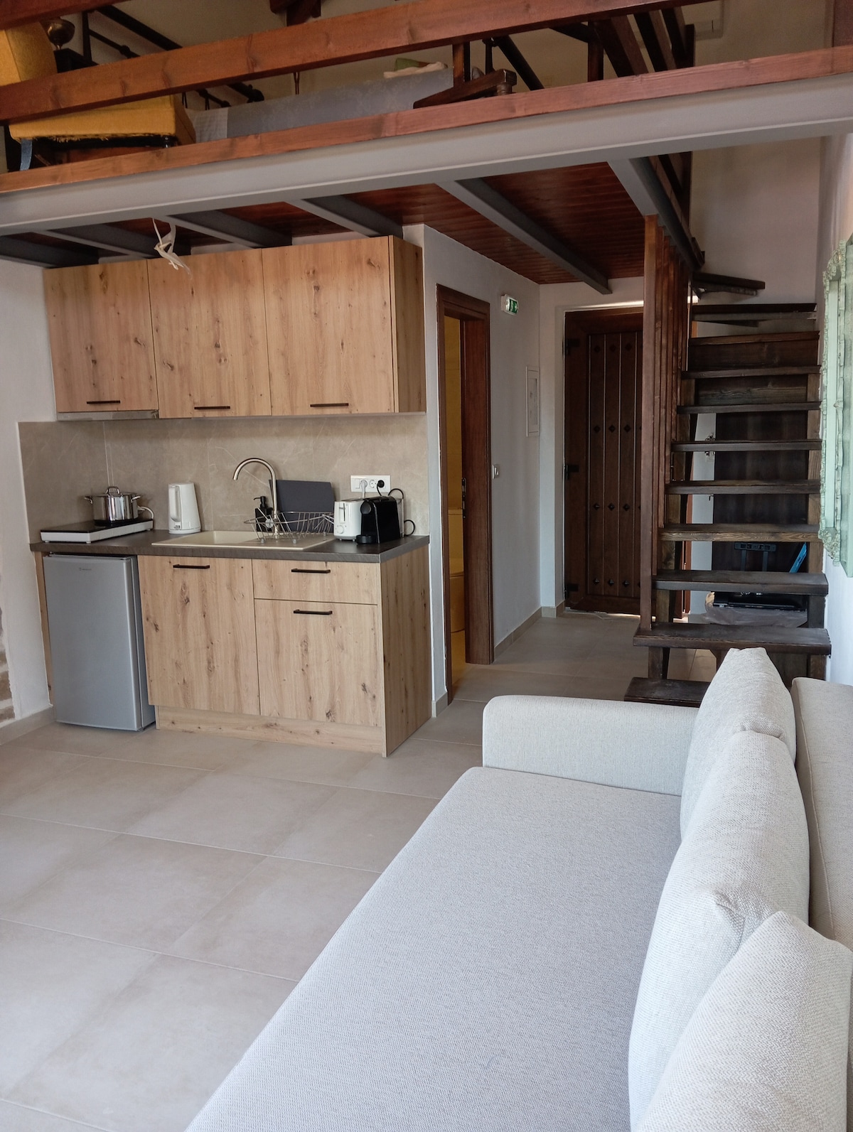 2 Maestros - a lovely studio for 2 looking westward with its own patio and looks westward, taking in the glorious sunsets over the sea. Dine outside or inside. There is a double king size bed. The kitchen has two electric hot-plates, fridge, toaster and kettle, cutlery and cookware, and a Nespresso coffee machine for your morning coffee! En-suite bathroom with walk-in shower. Smart TV. Private parking.