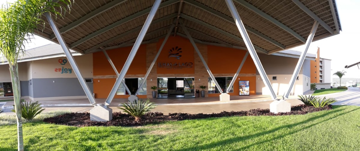 Hotel in front of Lake of Caldas Novas/GO, Eco Resort Lake Islands. Van egy vízi parkja fűtött medencékkel, gyermekmedencékkel, bárral, étteremmel, szaunával, edzőteremmel, multi-sport pályával, medencével, asztaliteniszezéssel, váltóval és sok minden mással. 1 hálószobás kétszemélyes lakás, 1 fürdőszoba, nappali tévével és kétszemélyes kanapéval, 4 személyes, tűzhely, minibár, mikrohullámú sütő, tányérok, poharak és evőeszközök (NEM rendelkezünk edényekkel és tisztítószerekkel). Szoba és szoba légkondicionálóval. Törülközőket és ágyneműt biztosítunk.