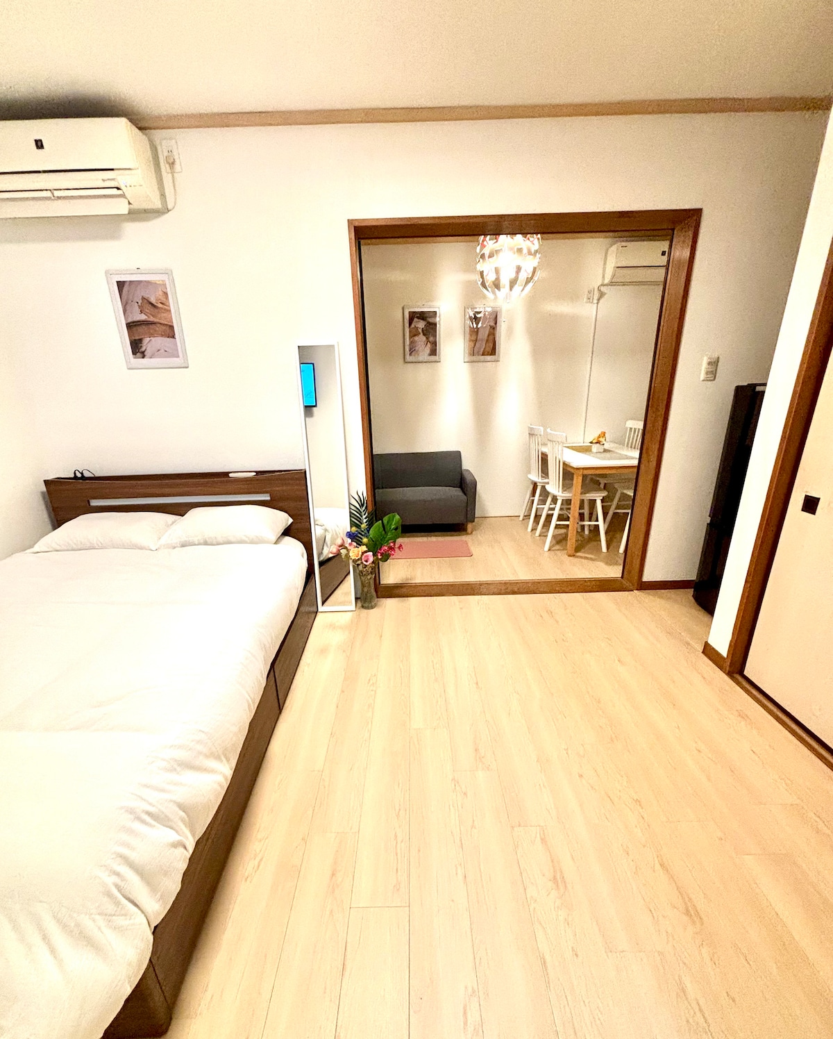 Newly constructed in December 2019, the room is modern/Japanese style and offers a comfortable space for you to spend time in. There are many room facilities, such as a kitchen and a washing machine for long-term guests, including families and business persons. Although the room feels out of the ordinary, you can spend time here and use the room practically. The room comes with two double beds, and up to 4 guests can stay in the room. (It is a 25㎡sized room that is ideal for 2 guests.)