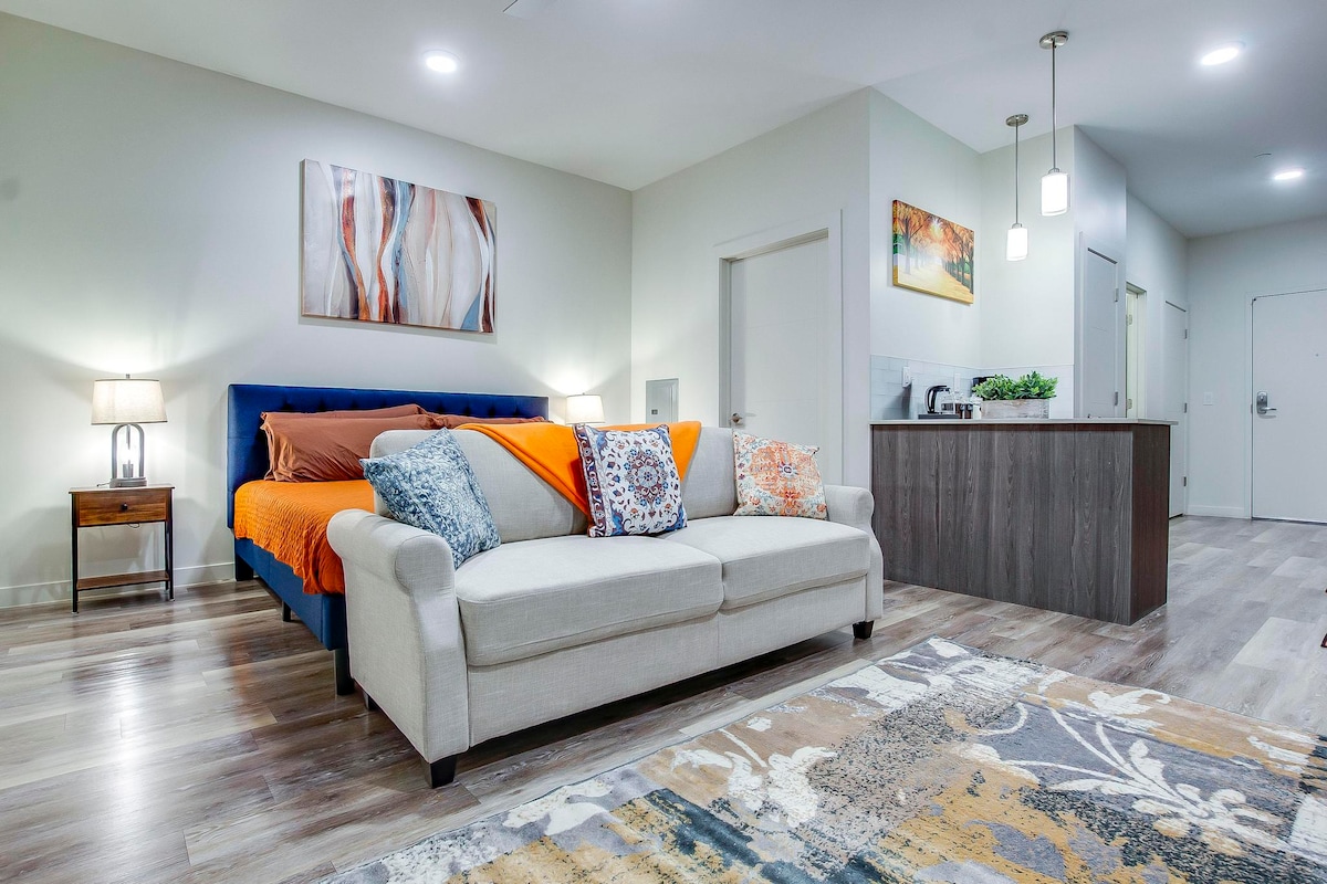 Stay in style and comfort while enjoying everything this apartment has to offer. Rest easy on a comfortable mattress, then start your morning with a complimentary cup of coffee. Work out in the gym, relax on the rooftop, or step outside to explore downtown just moments away. With dining, entertainment, and activities all around you, there’s always something to do. Wind down with a glass of wine and a movie on Hulu or Disney+. Book your stay and enjoy it all.