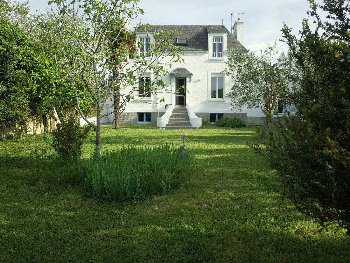 Villa spacieuse, au calme d'une impasse, équipée d'une piscine chauffée l'été et jaccuzzi. Idéalement située entre Finistère et Morbihan pour visiter la Bretagne. GR34 en contrebas de la maison, à 5mn à pied d'une magnifique plage de galets La maison peut accueillir 8 personnes confortablement 4 chambres à l'étage Bel espace de vie, un jardin de 3000m2 non clos, Grande terrasse Cuisine équipée Salon avec canapé, écran plat Table salle à manger 10 personnes Maison non fumeur Animaux non admis