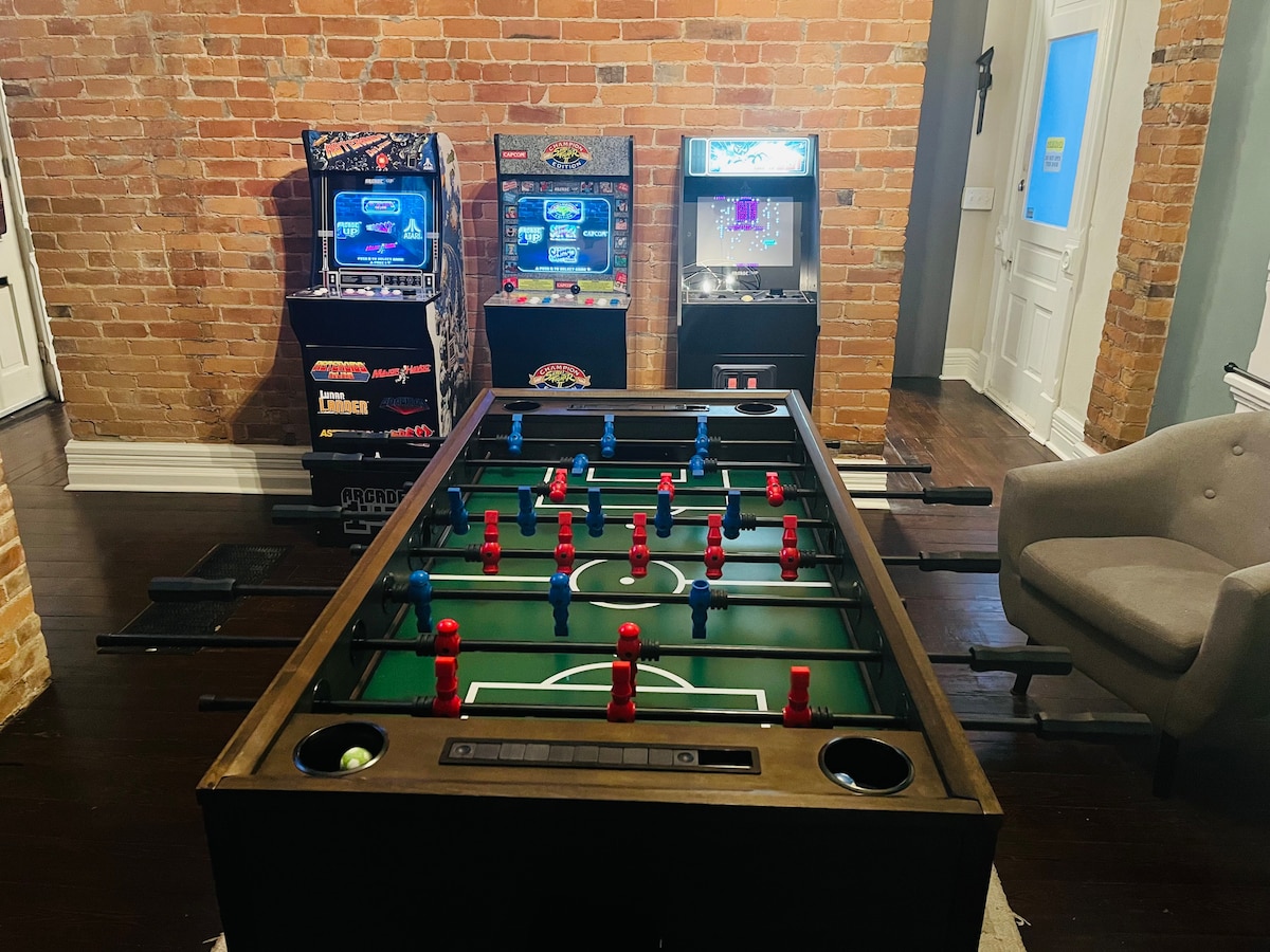 Pihenj stílusosan tágas szórakoztató búvóhelyünkön A térben kényelmesen elfér akár 8 vendég is, két king méretű ággyal, egy queen méretű ággyal és egy kihúzható kanapéval, amely memóriahabos matraccal rendelkezik. Lazíts egy hosszú nap után a luxus pezsgőfürdőnkben, vagy fiatalodj meg a szaunában és a masszázsfotelben. Élvezd a végtelen szórakozást a teljesen felszerelt játékteremben, ahol vadonatúj flippergépek, biliárdasztal, nyerőgépek, Golden Tee és egy több mint 5000 játékkal rendelkező Multicade játékgép vár – mindezt ingyen!
