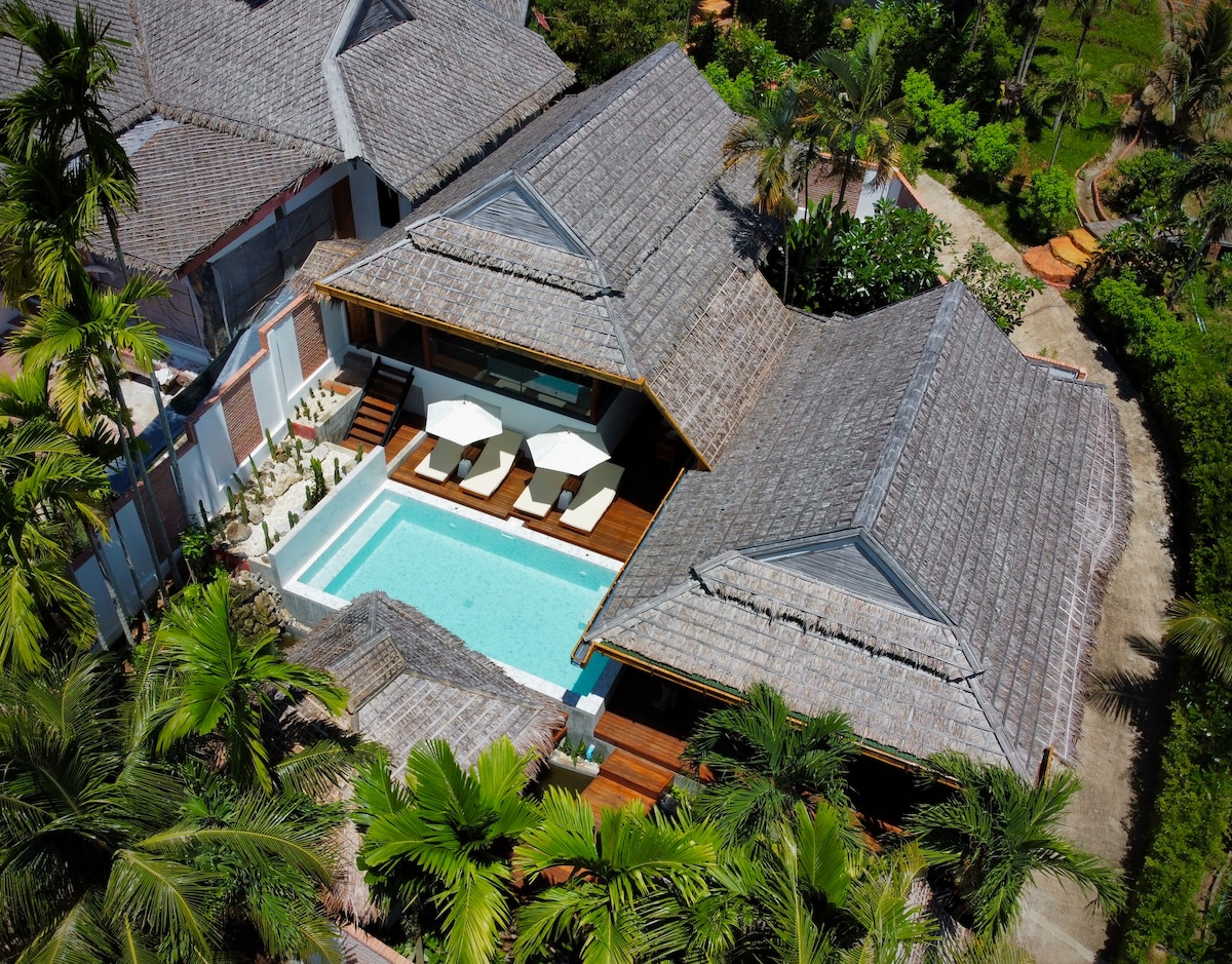 Privát trópusi medencés villa néhány percre a városközponttól, amely tökéletes egyensúlyt kínál a kényelem és a nyugalom között. Ideális családok számára, békés környezetet biztosít 180°-os kilátással a buja hegyekre és erdőkre – a saját nyugodt pihenőhelyed egy trópusi paradicsomban.