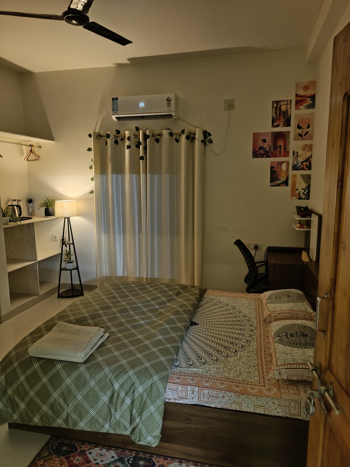 Beautifully decorated place for 2. You get- 1 spacious room (AC) - queen size bed + orthopedic mattress 1 attached toilet with comod 1 private washroom with indian toilet. 1 study table with comfortable chair 1 closet. Open terrace with plants. Not included: Geyser (you can ask for immersion rod) Wifi (Good network here so mobile internet will have no issues) Inverter (Not much power cuts in the area so generally it isn't a problem) No Lift (You have to use stairs for 2bd Floor)