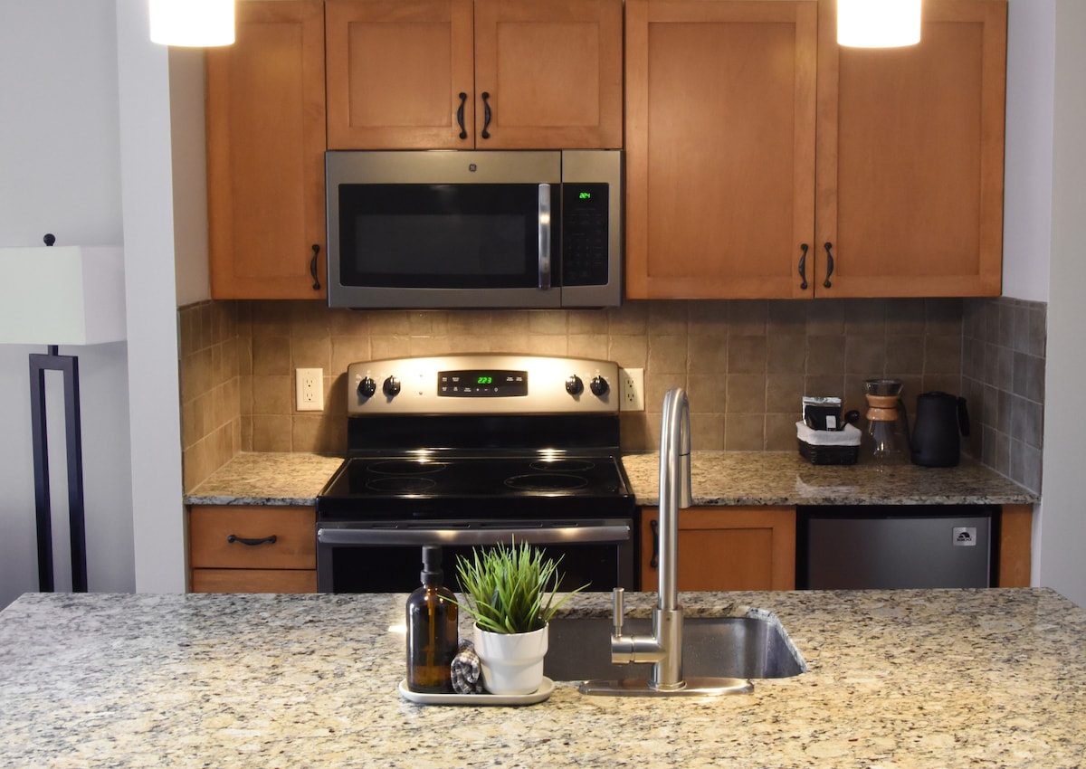 Tökéletes helyen, a belváros szélén, lenyűgöző kilátással a Kicking Horse folyóra, a Selkirk-hegységre és a sípályára. 1 hálószoba/1 fürdőszoba, egyike annak a mindössze 3 lakásnak, amelyek folyóra néző erkélyrel rendelkeznek. Teljesen felszerelt konyha és kényelmes kihúzható kanapé a nappaliban. Néhány lépésre a folyótól, a belvárostól, az élelmiszerboltoktól, az üzletektől, a sörfőzdétől, a Spirit Square-től és még sok mástól! Déli irányba néző erkély, ahol napozhatsz, miközben hallgatod a folyó hangjait. Önálló bejutás és ingyenes fedett parkoló.