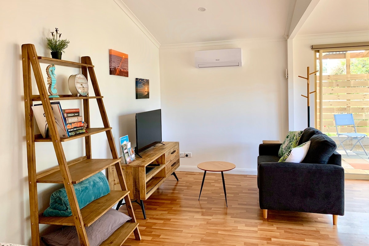 Our fully self-contained apartment is set in a peaceful neighbourhood, a short stroll down to the jetty, new boat ramp and famous long white beach. The apartment is on the ground floor of our newly built two storey home. You have private access with no stairs or steps, parking at the front door, a well-lit driveway and entrance, off-street parking for boats, free wifi and reverse cycle air conditioning. The private outdoor area and lounge overlooks our spacious garden with your own BBQ.