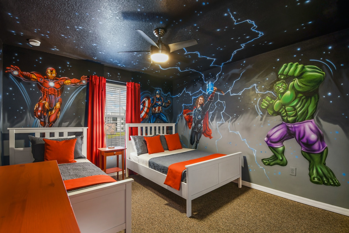 Üdvözlünk az álomkiruha-nyaralóban, csak pár percre a Disney-től! Luxus családi nyaraló – 8 főnek! Privát medence, pezsgő gyógyfürdő és dzsungel témájú színház. • 🛏️ 4 Disney témájú hálószoba saját fürdőszobával • 🏰 5 mérföldnél közelebb a Disney parkokhoz, üzletekhez és éttermekhez • 🏝️ Kalandvidéki dekoráció • 👨🍳 Gourmet konyha + mosógép/szárítógép és babafelszerelés • 🅿️ Ingyenes parkolás • 📞 Nonstop válasz Foglalj most, és kezdődjön a kaland!