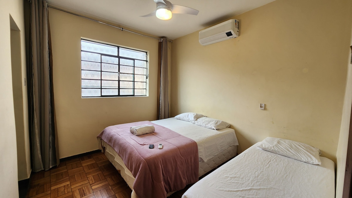 Pihenj meg a Casa Jardim Pampulhában, a zöldövezetben elhelyezkedő, kényelmes és kiváló elhelyezkedésű szálláshelyen. 80 m² legfeljebb 6 személy számára, légkondicionált nappalival, okostévével és kanapéággyal, 2 saját fürdőszobával, légkondicionálóval (fűtéssel), felszerelt, az étkezővel egybeépített konyhával, terasszal, WC-vel és hátsó udvarral, ahol kert, asztal és csocsóasztal vár. Erdőre és az állatkertre néző kilátás, parkoló és 220 V-os aljzat az elektromos járművek számára. 2 percre az állatkerttől és a CT of America-tól, 10 percre a Pampulha-templomtól. A szupermarket mellett. Profi takarítás és elérhető házigazda
