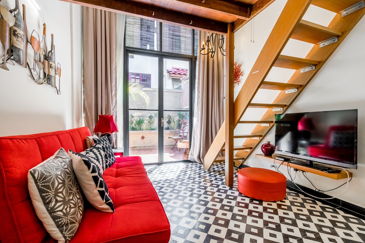 A romantikus balinéz élmény ihlette stúdió apartman hangulatos, hangulatos és elegáns. Az egység magas üvegablakokkal és ajtókkal rendelkezik, amelyek rengeteg természetes megvilágítást tesznek lehetővé, és amelyek megnyitják a saját udvarukat, ahol a vendégek pihenhetnek és élvezhetik a szabadban töltött időt. A hálószoba egy Queen méretű ággyal, és a padláson található. Az alábbi földszinten található egy kanapé, étkezőasztal, konyhasarok és WC. Biztonsági okokból csak regisztrált vendégek léphetnek be.