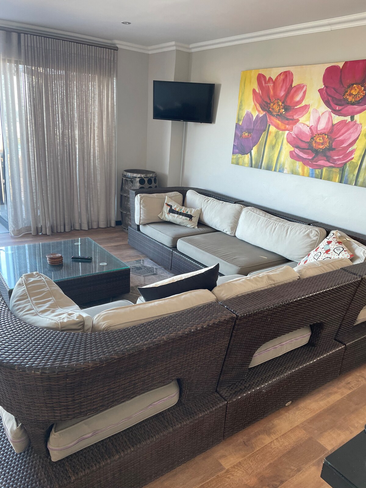 Welcome! Your Home Away from Home! Located in central Mossel Bay, our spacious new upgraded apartment boasts stunning sea and mountain views, perfect for families of four (2 adults, 2 children). Enjoy a large bedroom ( queen size bed) cozy living area with comfortable double sofa bed, and fully equipped kitchen. Relax by the pool and enjoy in/outdoor braai. Unlimited WiFi, Netflix, and DSTV, all you need for a perfect stay. Just 2.5 km from the beach and shopping, it’s the ideal getaway!