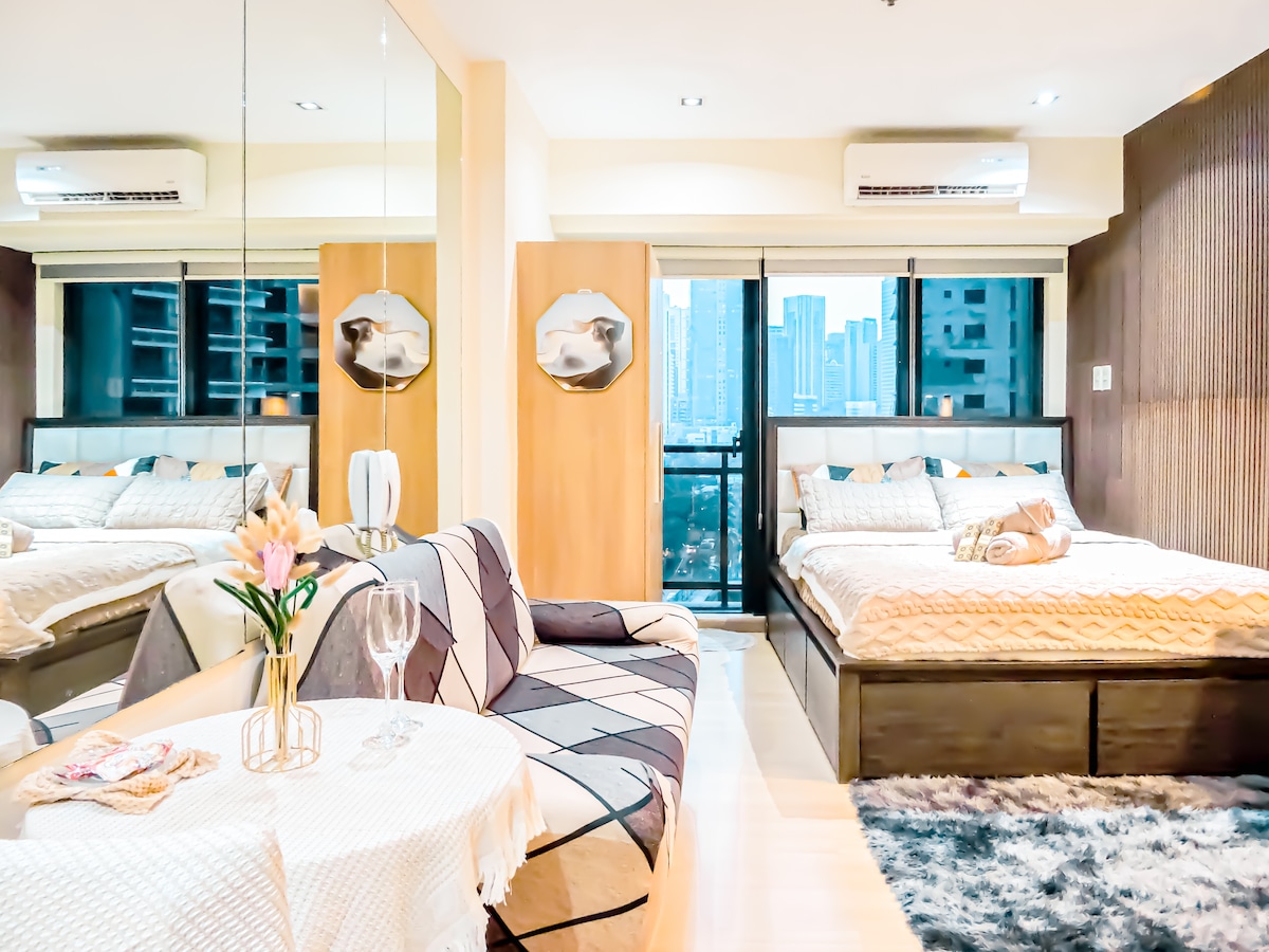 Szállj meg egy stílusos, belsőépítészi tervezésű trópusi lakosztályban, amelyből LENYŰGÖZŐ és AKADÁLYTALAN KILÁTÁS nyílik a városra a Knightsbridge Residencesben, egy 5 csillagos társasházban, amely központi helyen található Poblacionban. Élvezd ezt a fényűző, 40 négyzetméteres lakosztályt, amely TÁGASABB, mint a legtöbb apró, 20 négyzetméteres Airbnb a környéken. A 37. emeleti szálláshelyen 5 csillagos kényelmi szolgáltatások, teljesen felszerelt konyha, erkély és minden, ami a tökéletes szálláshoz kell: 200 Mbps sebességű üvegszálas Wi-Fi, Netflix, 43 hüvelykes TV, olimpiai méretű medence, modern edzőterem, szauna és éjjel-nappal elérhető ügyintéző