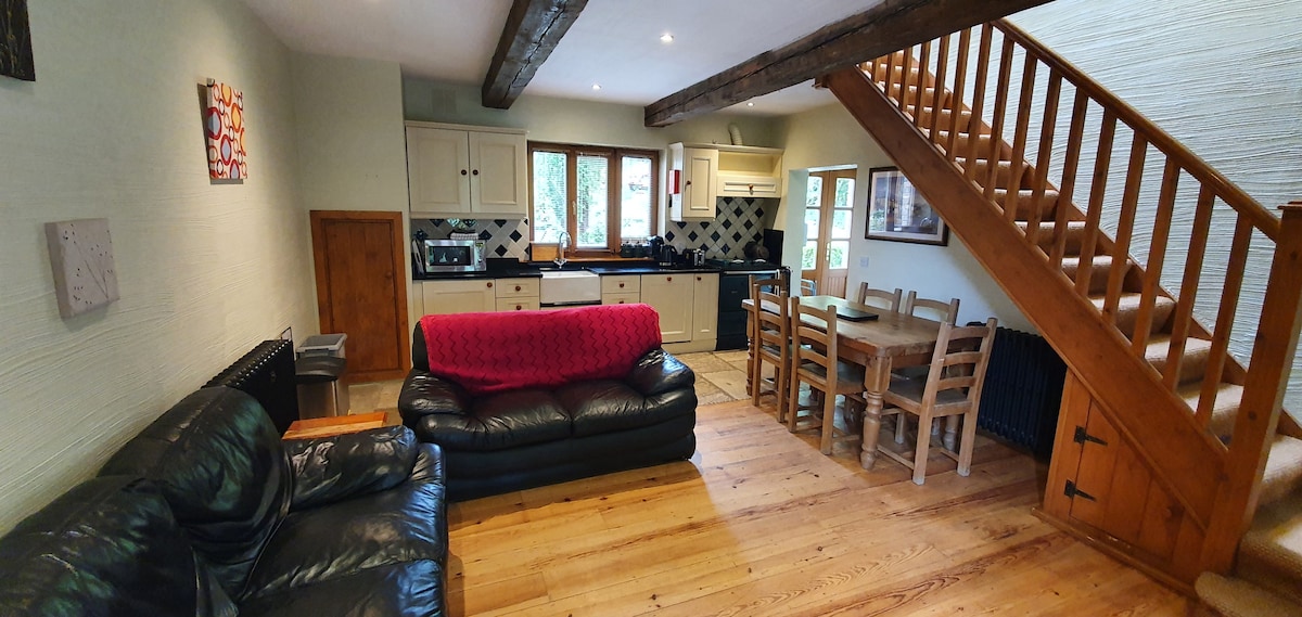 You'll love this romantic escape.Nestled at the end if our garden this beautiful host built cob cottage is cosy and different .The cottage has its own whimsical garden and a wrap around deck where you can relax in the hottub (Feb-nov) overlooking the countryside or cook up a storm on the patio kitchen . The openplan living space inside the cottage is enchanting with the round windows , glass bottle wall ,cob sofas and bespoke oak kitchen and a comfortable double murphy bed .Central heating .
