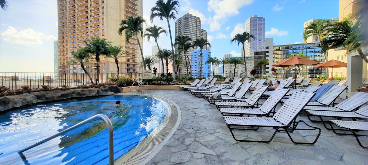 Hozd el az egész családot ebbe a nagyszerű lakásba, ahol rengeteg hely van a szórakozásra. Csak egy háztömbnyire a híres Waikiki strandtól. Nemrég felújított modern 1 hálószobás 1 fürdőszoba konyhával a Waikiki Banyanban. Pihentető kilátás a Diamond Headre és a medence teraszára. Az ingatlan fűtött medencével, jacuzzival (2), szaunaszobákkal, grillezővel (felújítás alatt) rendelkezik. Nincs üdülőhelyi díj, INGYENES parkolás (max. 6 láb), nagy sebességű wifi, kábel és Roku tv, teljesen felszerelt konyha, helyszíni mosógép és szárítógép. Vedd figyelembe, hogy ez egy nemdohányzó ingatlan.