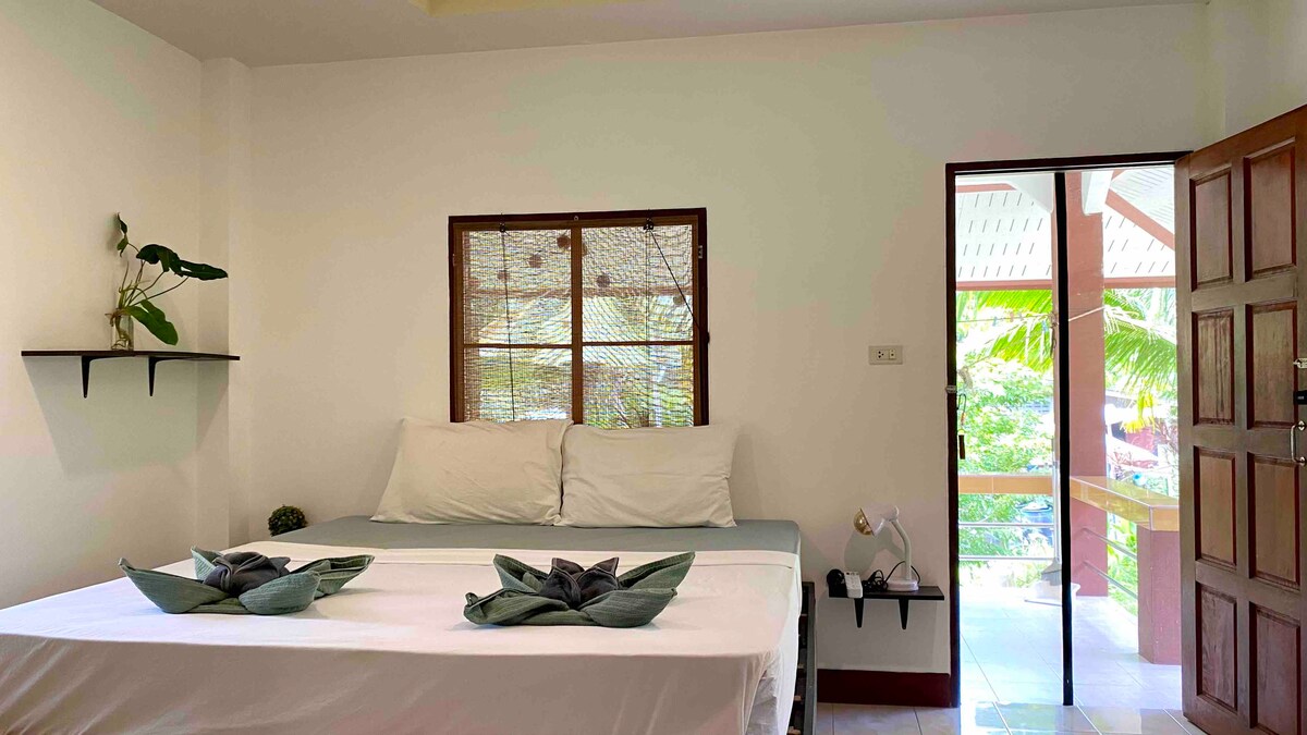 This cozy little house in Haad Salad is just a two-minute stroll from the beach. Inside, you'll find air conditioning and a functional kitchen perfect for cooking. The living area is bright and welcoming. The bedroom is a peaceful escape. Outside, the balcony features a hammock where you can relax and enjoy the tropical breeze. Surrounded by lush greenery, it's a serene retreat.