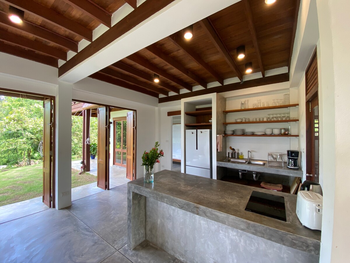 Üdvözlünk a Koh Yao Noi Nature Villa nevű modern építészeti villában, amely egy félreeső dombon található az erdőben, amelyet egy nagy, buja kert vesz körül. Térj vissza a számos szabadtéri társalgó egyikébe, és olvass el egy könyvet, jógázz, vagy egyszerűen csak hallgasd a madarak énekét. Ha szerencséd van, még az ikonikus szarvascsőrűeket vagy a közeli fákon játszó majmokat is észreveheted. A nyitott építészet természetes légáramlást biztosít, a ház pedig esővízgyűjtést használ, így környezetbarát.