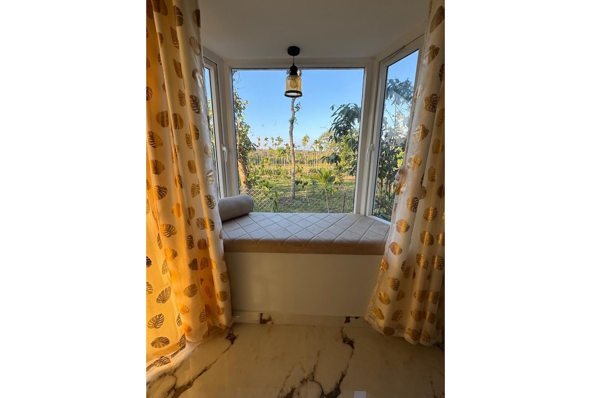 Offers a quiet, private stay surrounded by nature. Built with natural stone & earthy materials, the cottage blends rustic charm with modern comfort, features comfortable bed, attached bath & thoughtfully designed interiors, stay naturally cool. This is ideal for couples or solo travellers looking to disconnect from city noise & reconnect with nature,can access, estate walking paths, open spaces
