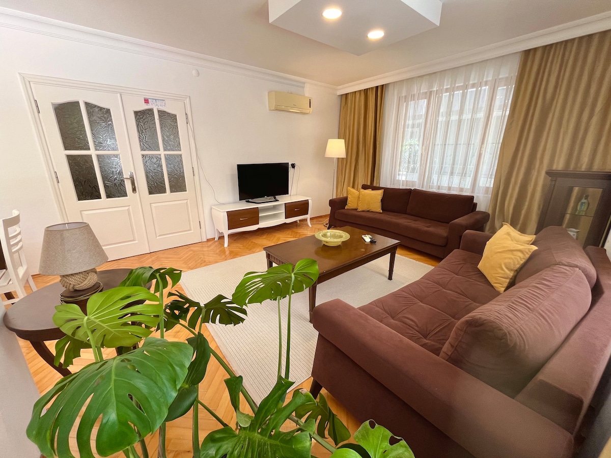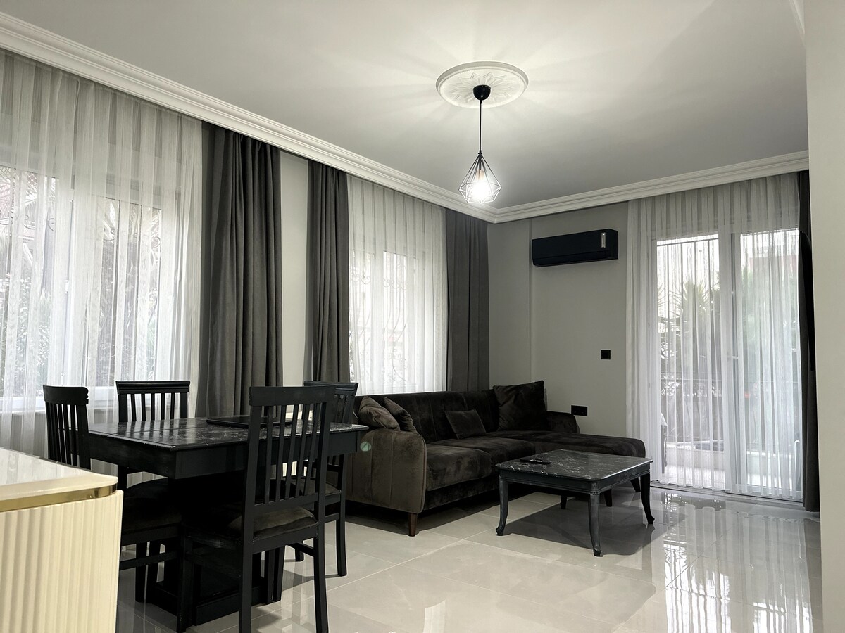 Hangulatos, családbarát lakás Gyalogtávolság a strandtól A Konyaaltı partjától mindössze 500 méterre található lakásunk egy biztonságos, háromemeletes családi lakóépület földszintjén található. Ideális, különösen gyermekes családok számára; lépcsőzés nélkül könnyen megközelíthető, a babakocsis bejárat rendkívül kényelmes. Az alapvető szükségletek, például a babaágy és az etetőszékek is készen állnak a lakásban.