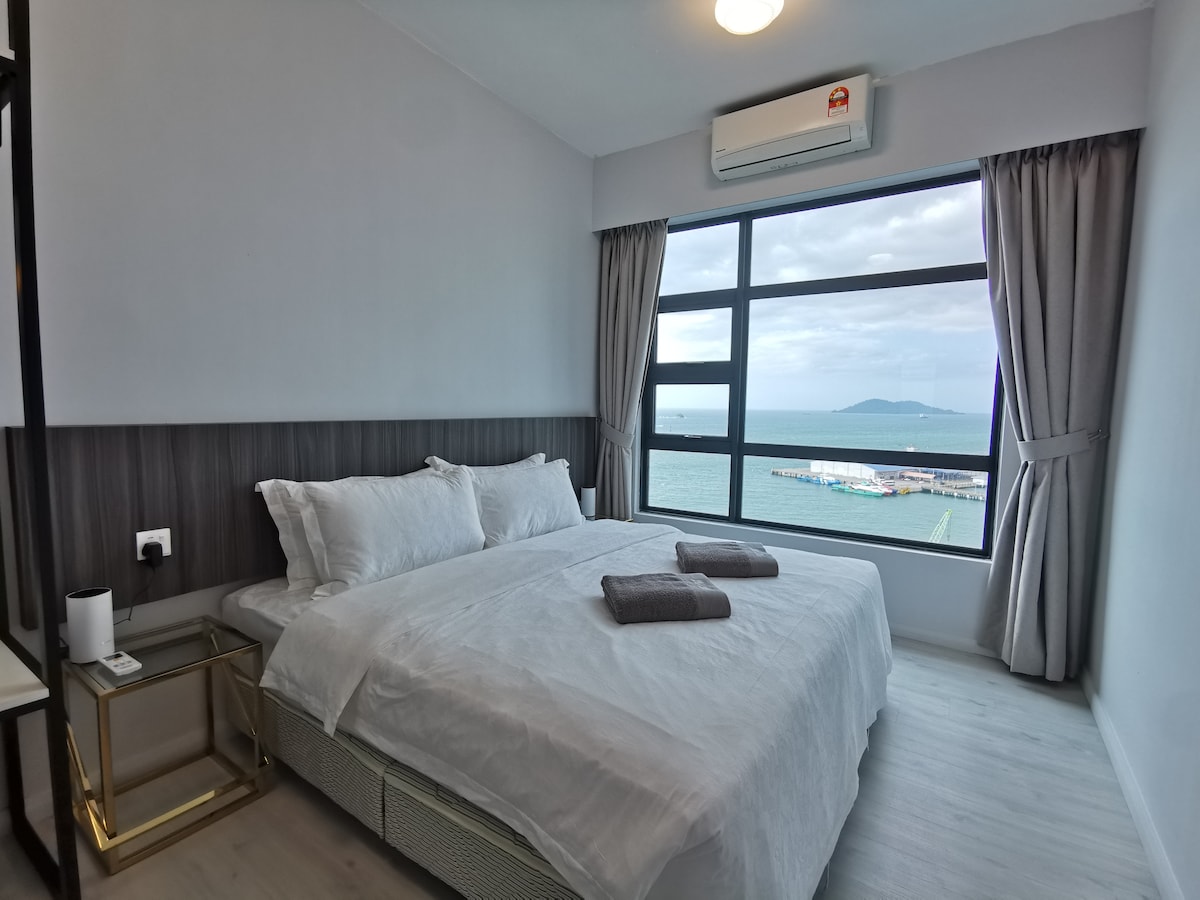 Stunning Sea view from the house. Chilling at the balcony. Swimming pool@level 6 Living Room, Queen Size bedroom, private sofa bed corner with curtains. Ensuite bathroom with hot and cold water shower. Large refrigerator with ice cube , mini kitchen with electric cooker, pot,plate,spoon,fork are available . Light cook at the kitchen. Filter water machine hot and warm. Please select 3 guest if you need single bed setting convert from sofa bed.