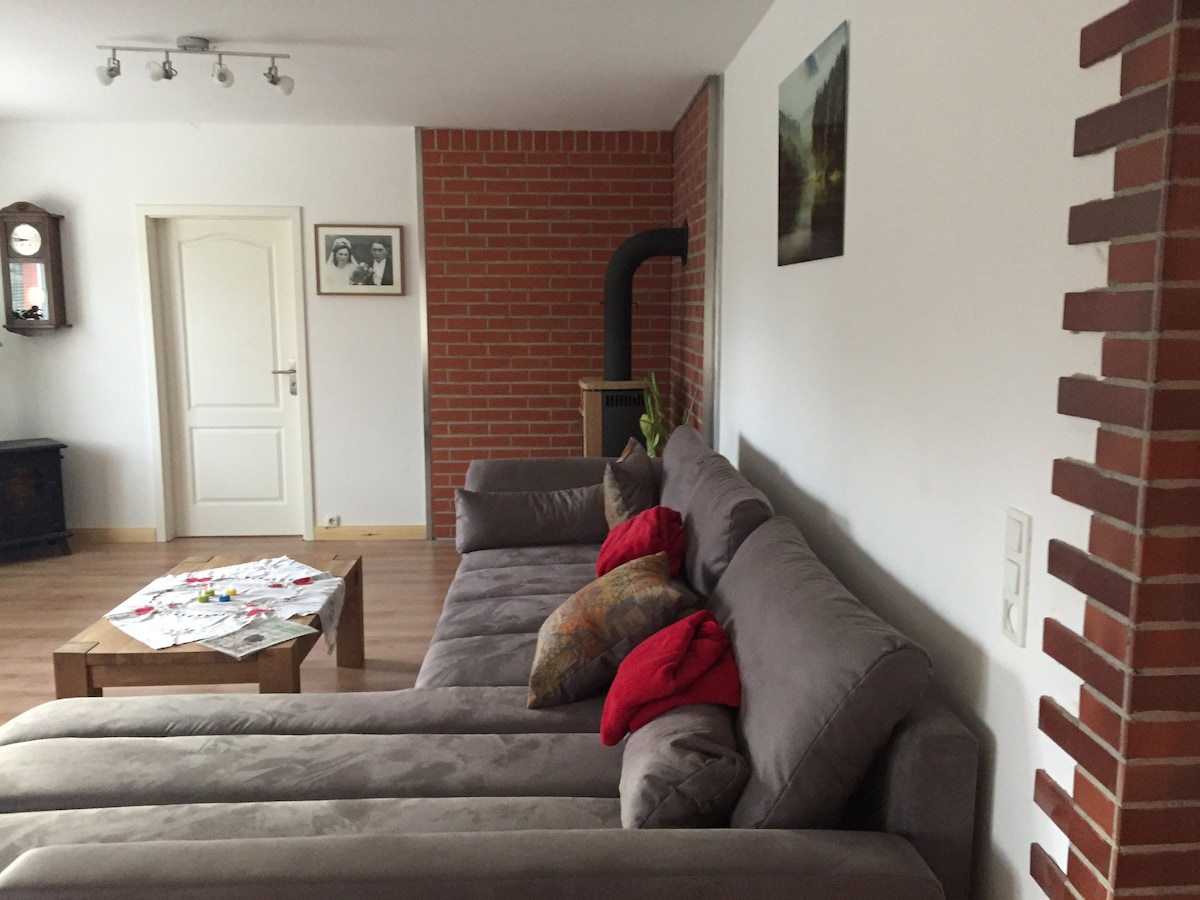 ... look out of your bed onto the water, enjoy the peace and quiet and listen to the rustle of the beech forest, experience bike tours directly on the water and enjoy nature. A beautiful, modern and rustic, low-energy half-timbered house with thatched roof, Moroccan tiles, oak floorboards and clay plaster walls awaits you. For activities there is a beautiful large garden with a forest swing, free steam sauna, outdoor shower and tub, a standup paddle, a paddle boat and 4 bicycles.