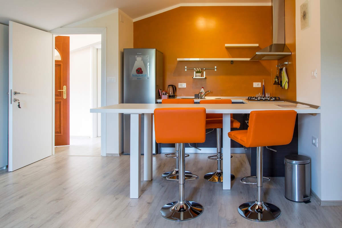 Ez a modern és gyönyörűen berendezett lakás egy családi ház második emeletén található. Az 50 m2-es lakásban 4-5 fő fér el, és egy konyhából és egy nappaliból, két hálószobából és kétszemélyes ágyból, egy zuhanyzós fürdőszobából és egy erkélyből áll. A lakás további kényelmi szolgáltatásai között találsz légkondicionálást,wifit, műholdas TV-t, közös grillt és parkolóhelyet az udvarban. Háziállatok nem engedélyezettek.