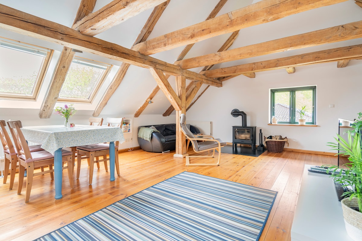 Egy 1900-ból származó, szeretettel felújított, egykori lóistállóban egy hangulatos lakás vár a vidék közepén. Nyugodtan használd a nagy kertet. A lakás két szinten található. A földszinten egy nagy hálószoba található kétszemélyes ággyal és kisággyal. Az emeleten található a tágas nappali és étkező, egy másik hálószoba két egyszemélyes ággyal, a konyha és a fürdőszoba. Két további matrac található a hangulatos, hegyes padlón.