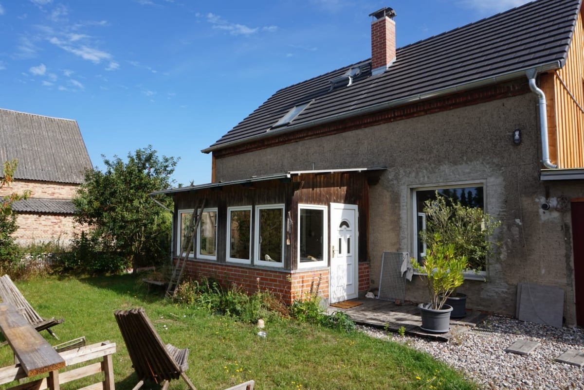 A lakás (2020. július közepe óta) kicsi, szeretettel és különösen berendezett, agyagfalakkal, a padlón kézzel festett téglákkal, kedvenc képekkel és bútorokkal. A ház mellett található, amelyet mi, gyermekes családként egy régi, háromoldalas udvaron élünk. Nincsenek közvetlen szomszédok, rengeteg természet, és gyönyörű kirándulásokat tehetsz minden irányban kerékpárral vagy autóval: a Balti-tenger, a szigetek, a Stralsund, a Greifswald, a Rostock, a Mecklenburger Seenplatte, a Peene, a Tollense...