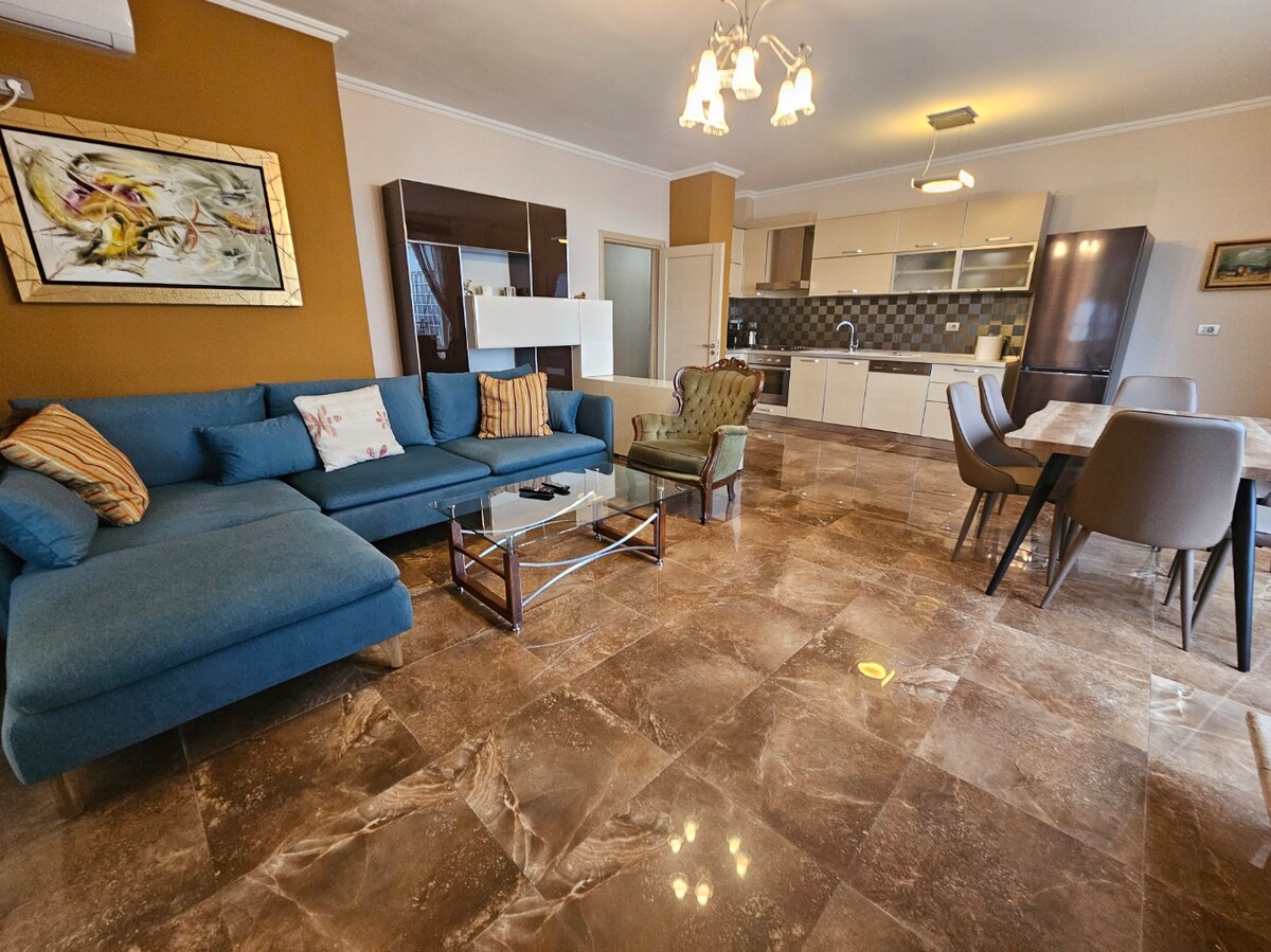 Lenyűgöző, tágas, teljesen új lakás, tökéletes a Ksamil teljes felfedezéséhez. Gyors hozzáférés a strandokhoz, üzletekhez és éttermekhez. Modern és napos szerkezet, amely a következőkből áll: - Nyílt terű nappali és konyha - 2 kétszemélyes hálószoba - 2 fürdőszoba zuhanyzóval - Nagy erkély székekkel, asztallal és grillezővel Csendes lakóövezetben fogsz megszállni, ahol pihenhetsz, és gyönyörködhetsz a tengerre nyíló gyönyörű kilátásban, miközben minőségi időt töltesz a családoddal és a barátaiddal.
