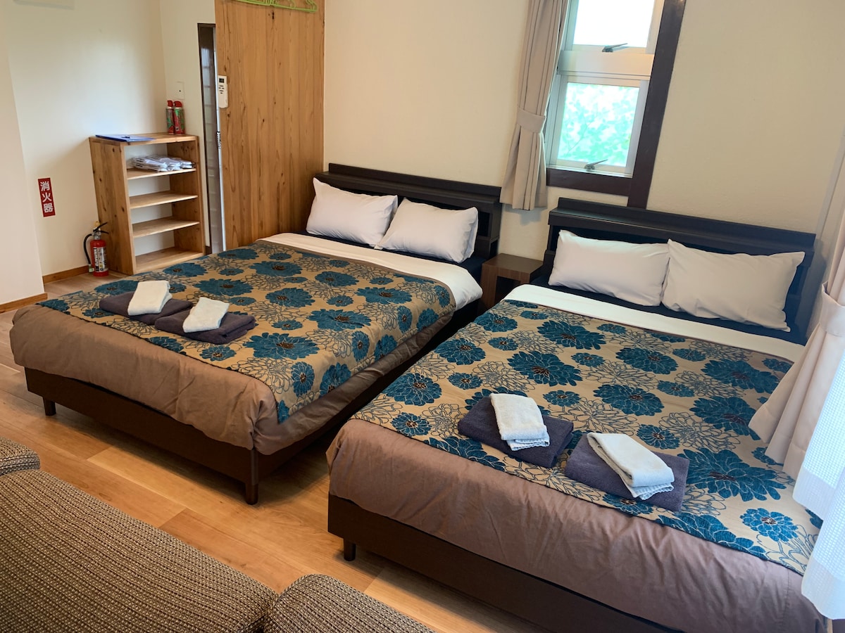 Kétágyas hálószoba! Felejtsd el az aggodalmaidat ezen a tágas és nyugodt helyen. Japán stílusú vendégházunk Okinawa szívében, a Yomitan területén található, közvetlenül néhány gyönyörű strand mellett, a Blue Cave, a Forest Adventure Park és számos nagyszerű étterem és kávézó közelében. Ez az egyágyas hálószoba kiváló minőségű ágyakkal, ágyneművel, légkondicionálóval és munkaterülettel rendelkezik. Tágas, közös konyhai nappalival és külön fürdőszobával rendelkezik, amely káddal és zuhanyzóval, valamint japán fűtött ülésekkel ellátott vécével rendelkezik.
