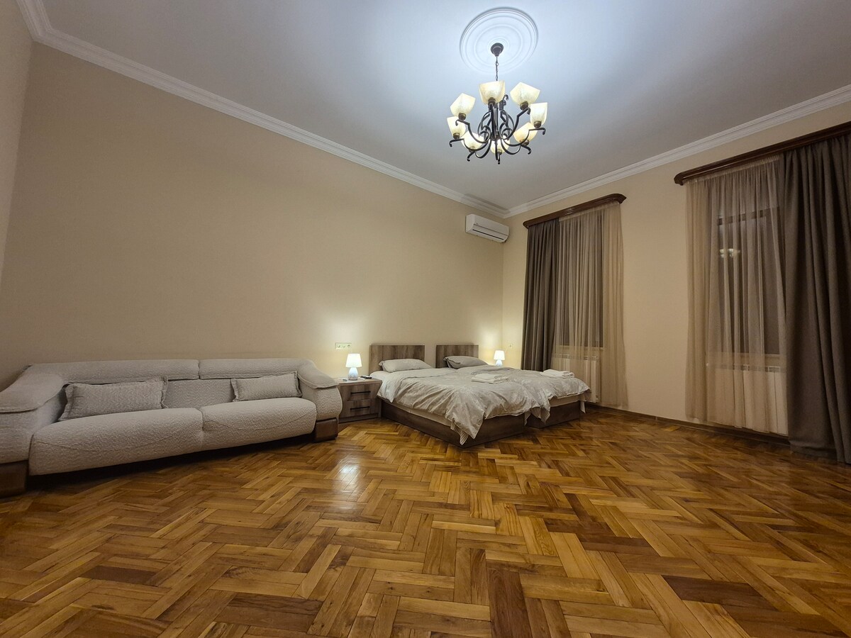 ✨ Tágas, 120 négyzetméteres lakás akár 8 vendégnek – ideális családoknak és csoportoknak. 3 hálószoba, nagy nappali kanapéággyal, 2 fürdőszoba, gyors Wi-Fi és önálló bejutás. Teljesen felszerelt konyha, TV, csendes és kényelmes szállás Kutaisiban. Kiváló elhelyezkedés, üzletekkel, gyógyszertárakkal és éttermekkel körülvéve a maximális kényelem érdekében. A közvetlenül az épület előtt található buszmegálló gyors összeköttetést biztosít a városközponttal és a ✈️ repülőtérrel (kb. 20 perc). 📍 A 2. emeleten található🛗 Nincs lift.