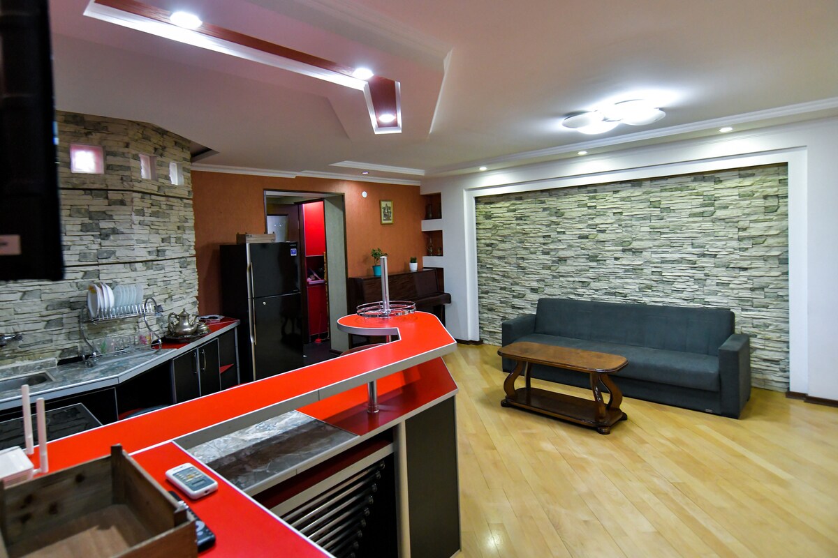 Stay in the heart of Kutaisi in our spacious 2-bedroom apartment with a large balcony and city views! Located right behind the historic Meskhishvili Theater, you're steps away from the central garden and Bagrati Cathedral. Enjoy a bright living room, AC, fast free Wi-Fi, and flat-screen TV. Bonus: Free private parking and access to a shared terrace. Ideal for couples, families, or friends. Experience total comfort in the perfect city center location!