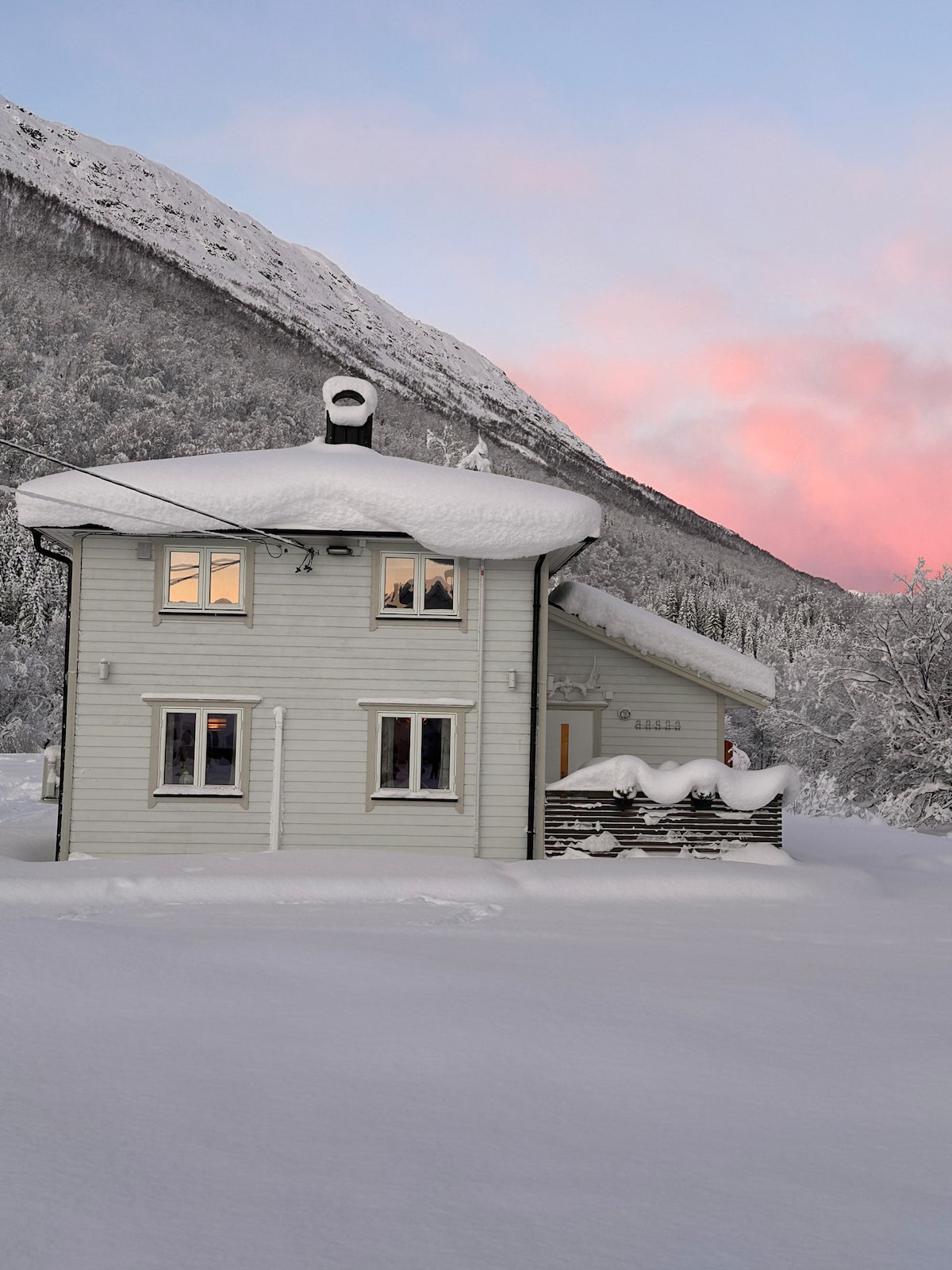 Hangulatos otthon a családnak, gyönyörű és csendes helyen, nagyszerű kilátással a fjordra. Tökéletes a pihenéshez, az északi fény megtekintéséhez, horgászathoz, síeléshez és csodálatos túrákhoz a környező területeken. A ház közel van az E6-os úthoz. Van egy konyhája, egy nappalija, egy nagy terasza, zuhanyzója/WC-je és 3 hálószobája, amelyekben legfeljebb 6 fő fér el. A lakás 2025-ben lett felújítva, a bútorok modernek, kényelmesek.