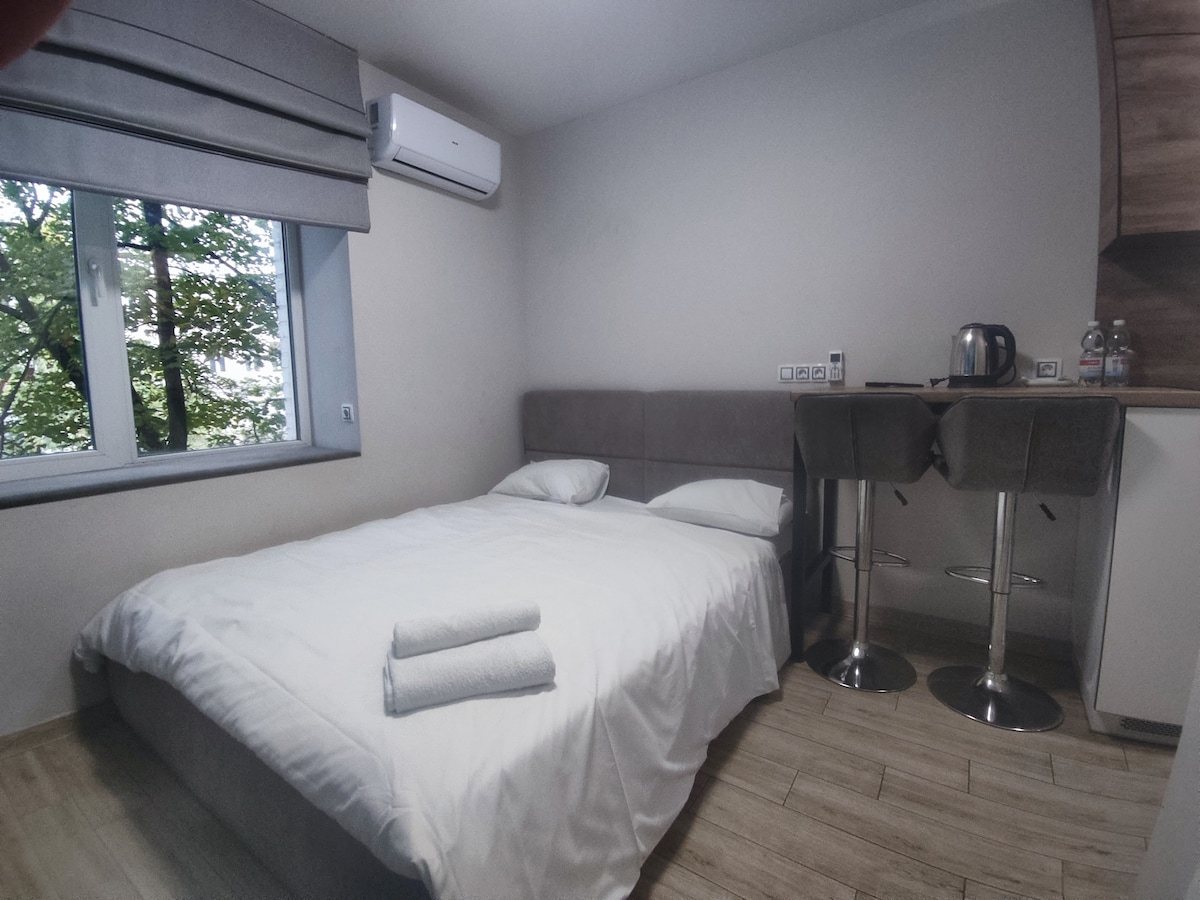 Szeretnélek üdvözölni ebben a 2021-ben frissen felújított luxus mini-stúdió Kijev központjában. A nagy ágyat és matracot (160x200) a nagyobb szállodák egyik beszállítója tervezte. Az ágy az ablak szintjén található, így anélkül nézheted az utcát, hogy felkelnél. A lakás ablakai tripla üvegezésűek, így annak ellenére, hogy a városközpontban található, a lakás nagyon csendes. A konyha teljesen felszerelt. Modern, tiszta zuhanyzó és vécé. Egyszerű önálló bejutás 14:00 után.
