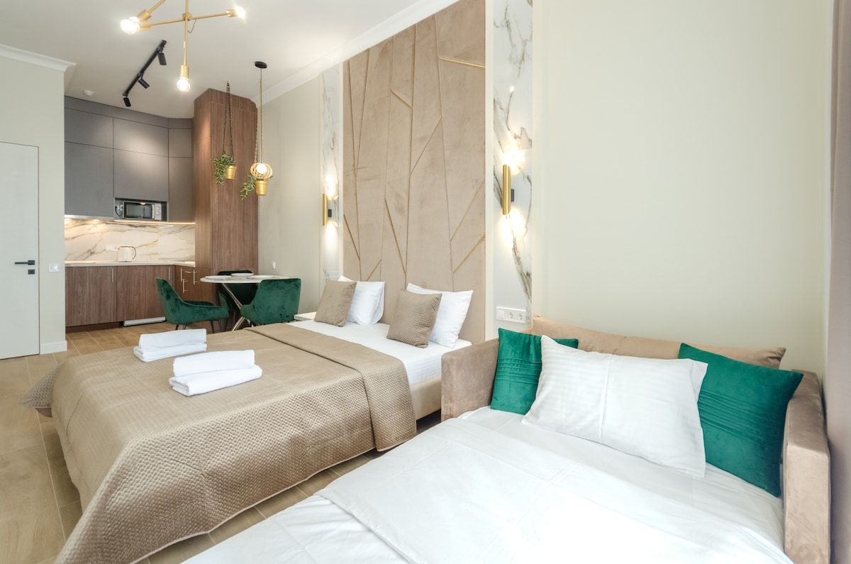 barasport városi apartmanok Stúdió arany stílusban - designer apartmanok a főváros központjában. Ez található egy új elit épület Pechersk, egy 5 perces sétára a metró és 15 percre a vasútállomástól. A város fő üzleti és turisztikai helyszínei sétatávolságon belül vannak. Az új, 30 négyzetméter alapterületű stúdió arany stílusú apartman egy nagy franciaágyat kínál, nagy, kifinomult fejtámlával, kényelmes ortopéd matraccal, takarókkal, hipoallergén párnákkal. Ebben a lakásban lesz hófehér ágynemű, szép törülközők és márkás piperecikkek! Van egy teljes konyha, hűtőszekrény, elektromos tűzhely, mikrohullámú sütő, vízforraló és minden szükséges edények. Van egy funkcionális szekrény, széf, egy munkahely, TV-vel és Wi-Fi-vel. A kombinált fürdőszobában tágas zuhanyzó, vízmelegítő és hajszárító található. A legfelső emeleti lakás ablakaiból csodálatos kilátás nyílik a városra Barasport stílusban.
