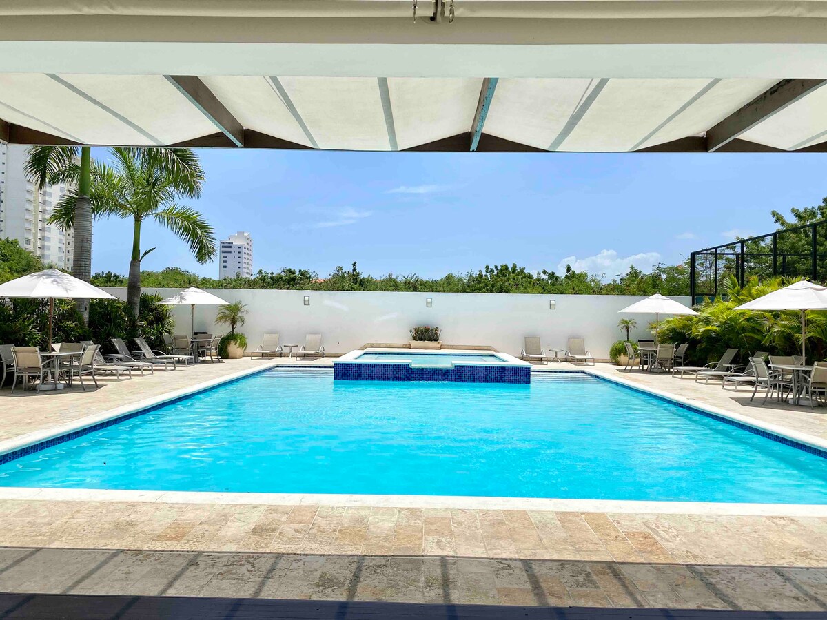 Gyönyörű lakás Juan Dolio strandjának közelében, teljesen felszerelt konyhával, két hálószobával, légkondicionálással minden területen, erkéllyel és ingyenes Wi-Fi-vel 24 órán keresztül. 2 lift, edzőterem, nagy medence jacuzzival, grillező, teniszpálya, focipálya, játszótér, terasz, közös mosóterület, parkoló, szuper kényelmes ágyak és egyéb kényelmi szolgáltatások. A környéken többek között bankok, éttermek és éjszakai létesítmények találhatók.
