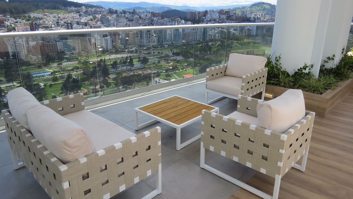 Élvezd Quito legjobb elhelyezkedését: modern és hangulatos apartman a La Carolina park előtt. Tökéletes családok, vezetők és utazók számára, akik kényelmet és azonnali hozzáférést keresnek a város legjobb részeihez, például éttermekhez, metrómegállókhoz és bevásárlóközpontokhoz. - Wi-Fi - Netflix - Vasaló - Teljesen felszerelt konyha - Hajszárító - Mosógép és szárítógép - Meleg víz – Távirányítós függönyök Közösségi területek - Edzőterem - Jacuzzi - Grillezőhely - Egy mozi - Fuvarozó