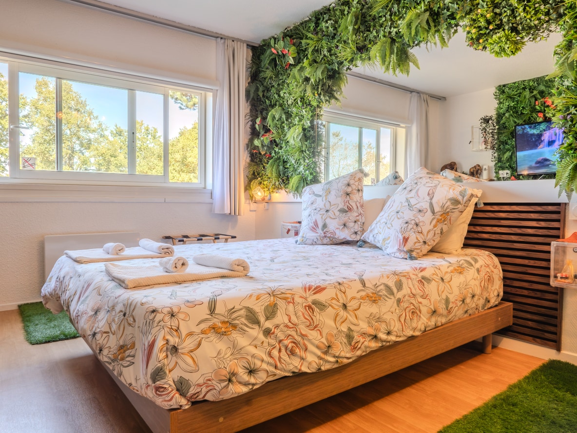 Un studio intime et végétalisé Offrez-vous une escapade inoubliable dans ce studio végétal, unique. Plongez dans une ambiance apaisante, où les murs sont habillés de verdure où chaque détail à été soigneusement pensé pour éveiller vos sens. 🛏️ Une literie confortable décorée de pétales de rose (lit 160/200) 🚿 Une douche avec vue sur la chambre ❤️ Des extras payant romantiques disponibles : petit déjeuner, pétales, jeux coquins.. etc.. ✨ Réservez votre moment dès maintenant. ✨