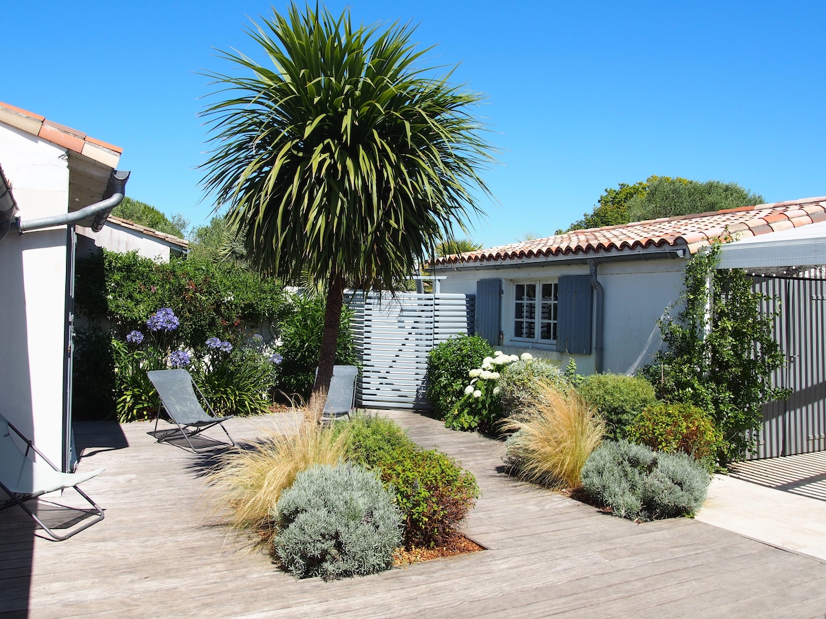 La Couarde szép falujában, Île de Ré központjában, az impasse des Vignes aux folies mentén, 2 hálószobás ház (ágynemű és törölköző biztosított), Île de Ré stílusában berendezve, kellemes nappalival és teljesen felszerelt amerikai konyhával. Nagyon virágos kert, nyugágyakkal és terasszal, ahol az olajfák árnyékában fogyaszthatod el az ételeidet. A kerékpárutak szívében, 300 méterre a strandtól, üzletektől és buszmegállótól. Pihenj ezen a nagyon csendes környéken.