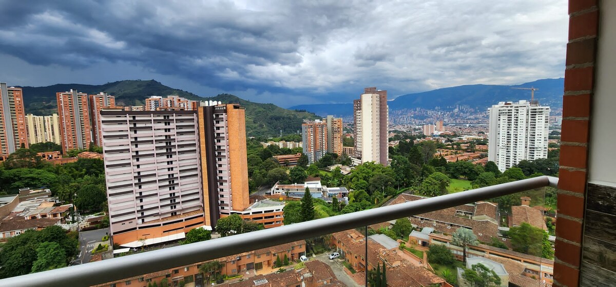 Üdvözlünk a Medellinben! Tágas lakás, ahonnan könnyen elérhető a metróállomás, az éttermek és a bevásárlóközpont. Nappali/étkező, 2 hálószoba, 1 kényelmes kanapéágy, 2 teljes fürdőszoba, teljesen felszerelt konyha mosógéppel, megbízható wifi/tévé és egy erkély gyönyörű kilátással a Valle de Aburra-ra, ahol gyönyörű naplementét érhetsz el a 14. emeleten. Az épület 24 órás biztonsági szolgálattal, lifttel és saját parkolóval rendelkezik, hogy békés és biztonságos helyen élvezhesd a szálláshelyen eltöltött idődet
