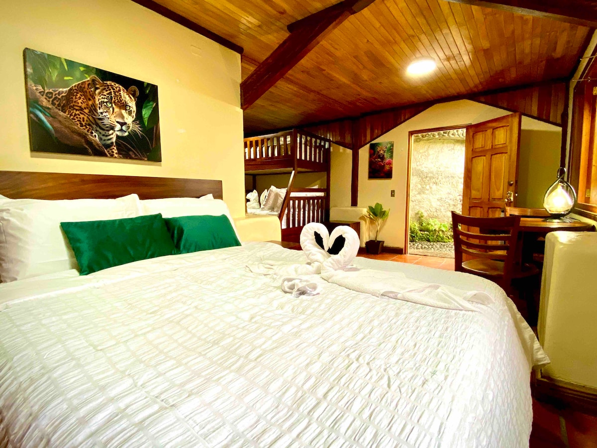 Gyönyörű szállodai szoba nagyon privát helyen, amelyet természet és kertek vesznek körül. Két nagyon kényelmes ággyal, privát fürdőszobával és meleg vízzel, légkondicionálóval, wifivel, kábel tévével, hűtővel rendelkezik. A helynek van egy nagy medencéje, ahonnan fantasztikus kilátás nyílik az Arenal vulkánra. Reggelente ízletes, svédasztalos reggelit fogsz fogyasztani, amely reggelit is tartalmaz.