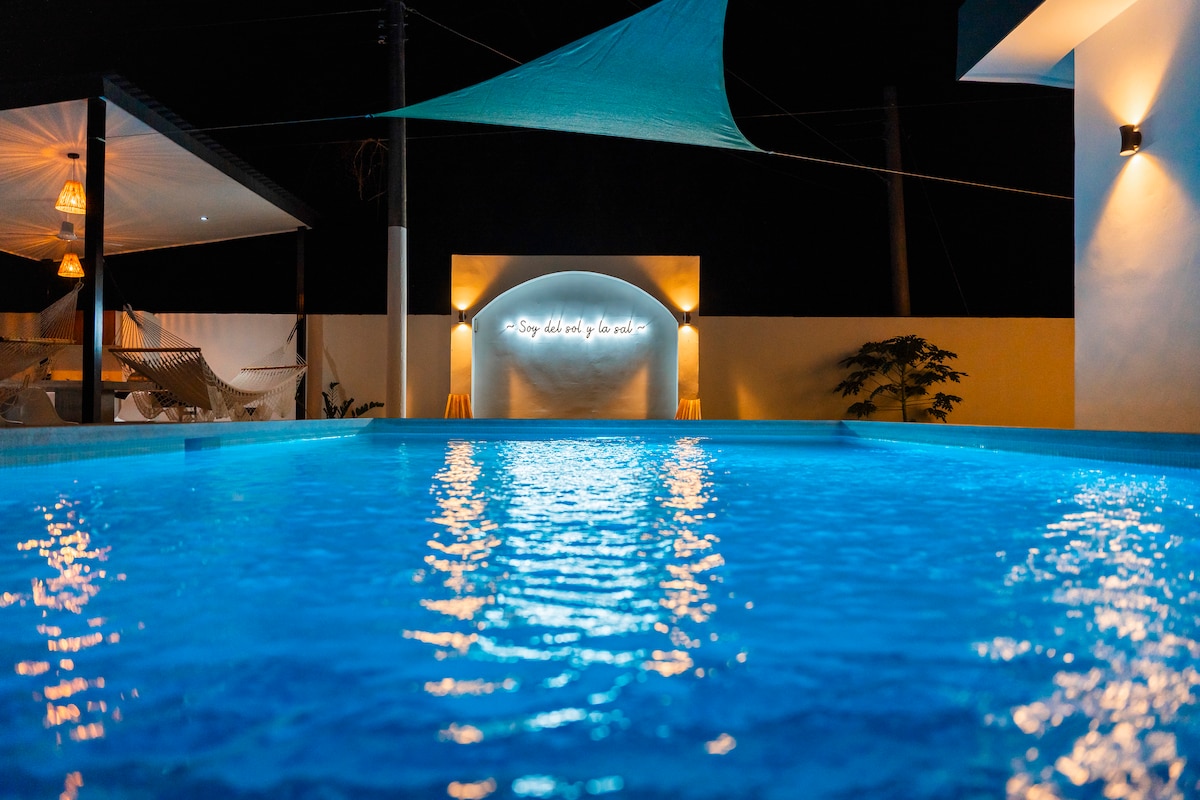 Élvezd a Surf Cityben található privát tengerparti házat nagy medencével és vízeséssel. Egy biztonságos komplexumban található, mindössze néhány percre El Tunco és a Sunset Park. Négy légkondicionált hálószobával, teljesen felszerelt konyhával és egy pergola árnyékában pihenhetsz. Ideális csoportok vagy családok számára, akik kényelmet és magánszférát keresnek az óceán közelében.