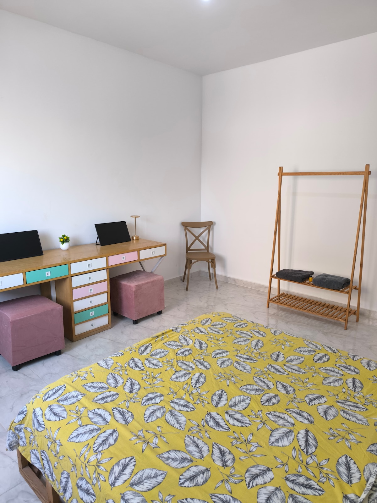 Profitez d’un séjour confort dans cette chambre spacieus au sein de notre appartement S+3 située dans un environnement calme. Point fort : un espace de travail inspirant avec un large bureau aux touches colorées. Confort : un lit double avec sommier en bois massif, des rideaux opaques pour garantir des nuits paisibles dans le noir. Clarté & Équipements : Une grande fenêtre offrant une belle luminosité tout au long de la journée.