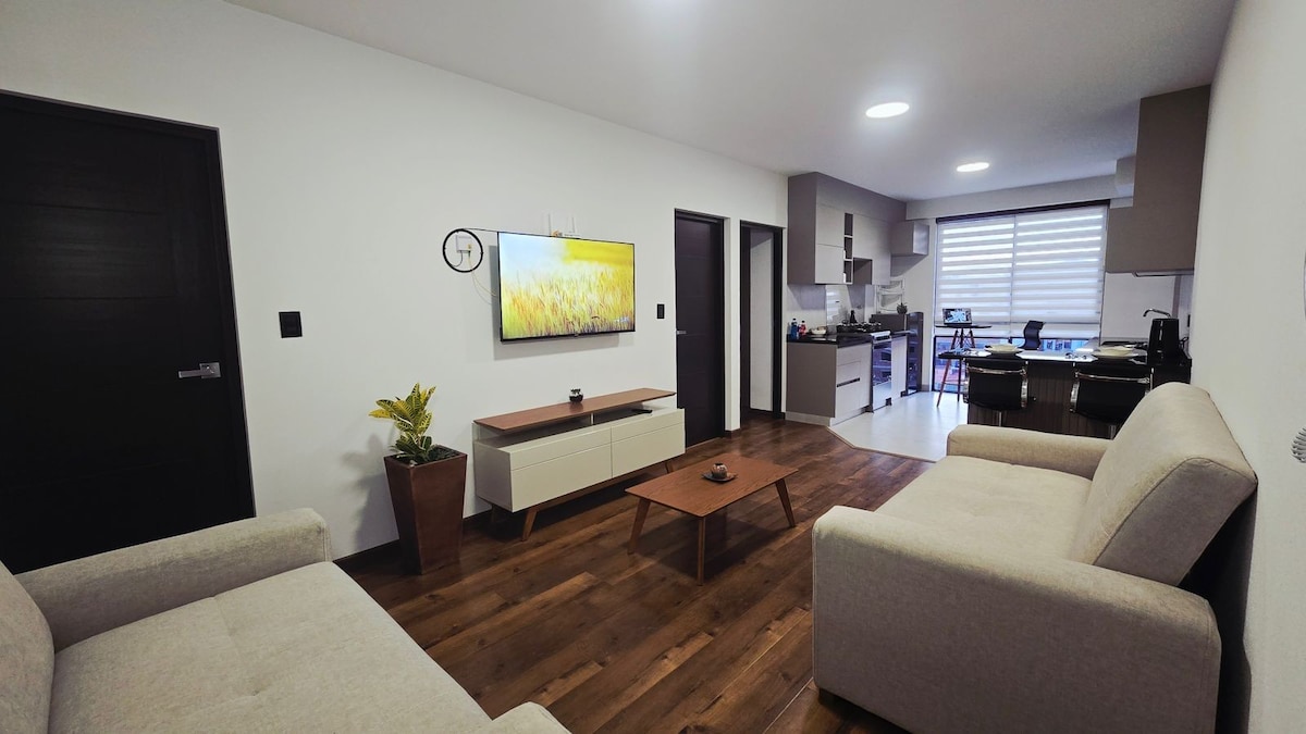 Acogedor y cómodo departamento de una habitación, espacio lleno de luz natural en una zona residencial y tranquila de la ciudad, cerca a supermercados, farmacias y agencias de bancos. Ingresa por un patio común es necesario subir escaleras a un tercer piso, cuenta con una habitación con dos camas, baño y cocina independientes y una terraza. se puede tener garaje sin costo adicional.