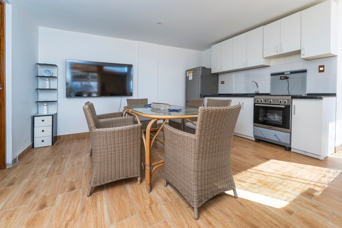 Apartman a 3. emeleten Playa Doradában – Camaná, 1 percre a strandtól. Kiváló legfeljebb 6 fős családoknak. 2 hálószobával, 3 ággyal és 1 fürdőszobával, valamint nappalival és felszerelt konyhával rendelkezik. A tengerpartra néző teraszról gyönyörködhetsz a naplementében. Háziállatbarát szállás (1 háziállat). Funkcionális és jól elrendezett hely a kényelmes óceánparti szálláshoz.