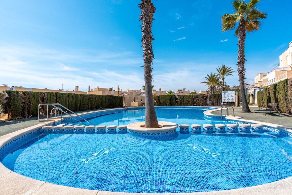 Üdvözlünk otthonos nyaralónkban, ahol a tetőteraszon ihatsz egy hideg italt, vagy együtt ebédelhetsz a piknikasztalnál. Az úszómedence 50 méterre található a háztól. A hangulatos tengerparti cabo roig 1300 méterre található, és gyalog és autóval is megközelíthető. Különböző hangulatos éttermek 800 méterre. Az XL bevásárlóközpont 1500 méterre található. Golfklub autóval 7 perc alatt. Torrevieja boulevard 15 perc autóval.