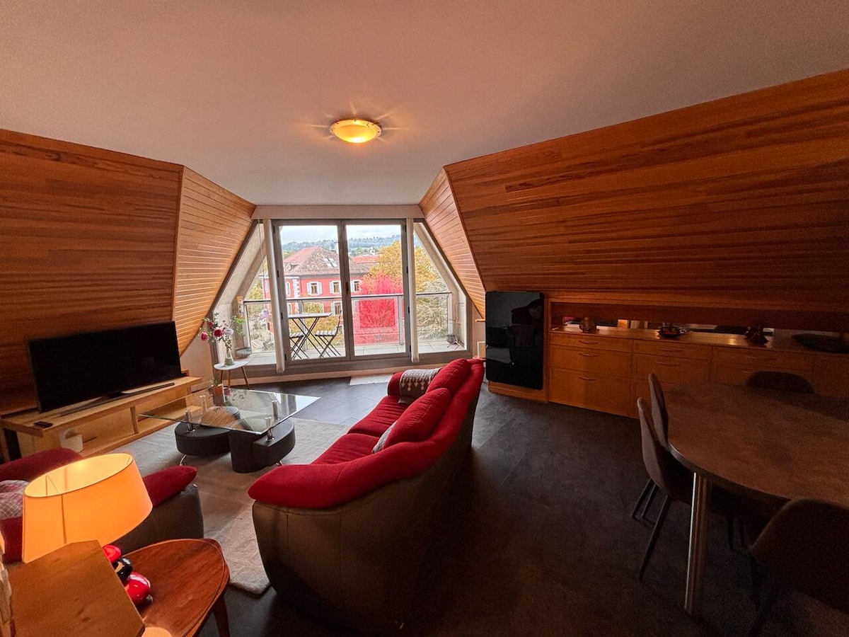 Gyere és élvezd az egyedi élményt az Annemasse-i városi faházunkban. A lakás a legfelső emeleten található, ahonnan akadálytalan kilátás nyílik a környező hegyekre. Egy napos túrázás, síelés vagy munka után pihenj a kandalló mellett, és lazíts a privát pezsgőfürdőben. Mont-Salève-től 5 percre, Genftől 20 percre és 50 percre az első sípályáktól.