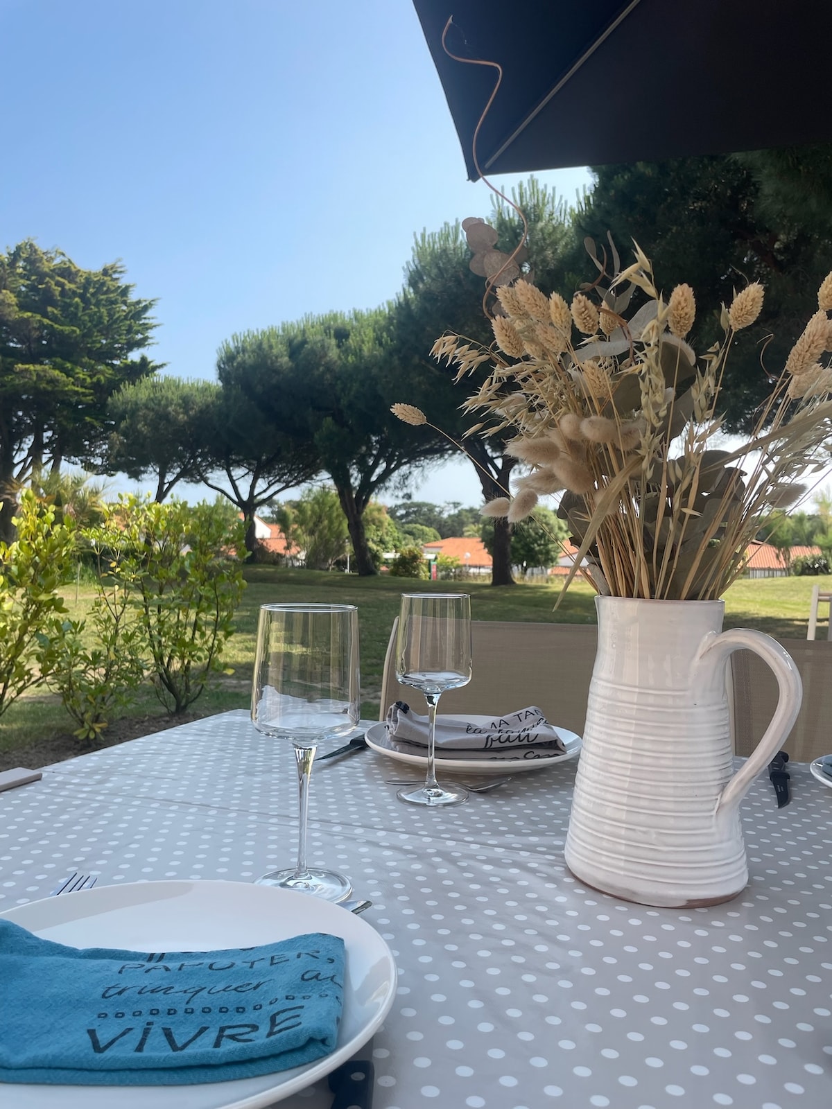 Appartement 3/4 personnes , terrasse avec vue sur le golf, les pins et la mer. Activités disponibles sur place : Du 27 Avril au 15 Septembre : Espace aquatique accessible avec bracelets disponibles dans l appartement. Cours d aquagym gratuit du lundi au vendredi en juillet et Août . Mise à disposition gratuite de raquettes de tennis et club de golf à l accueil de la maison des animations. Animations en juillet et Août dans le complexe. Port de Bourgenay à 5mn à pied. Plage du Veillon à 15mn
